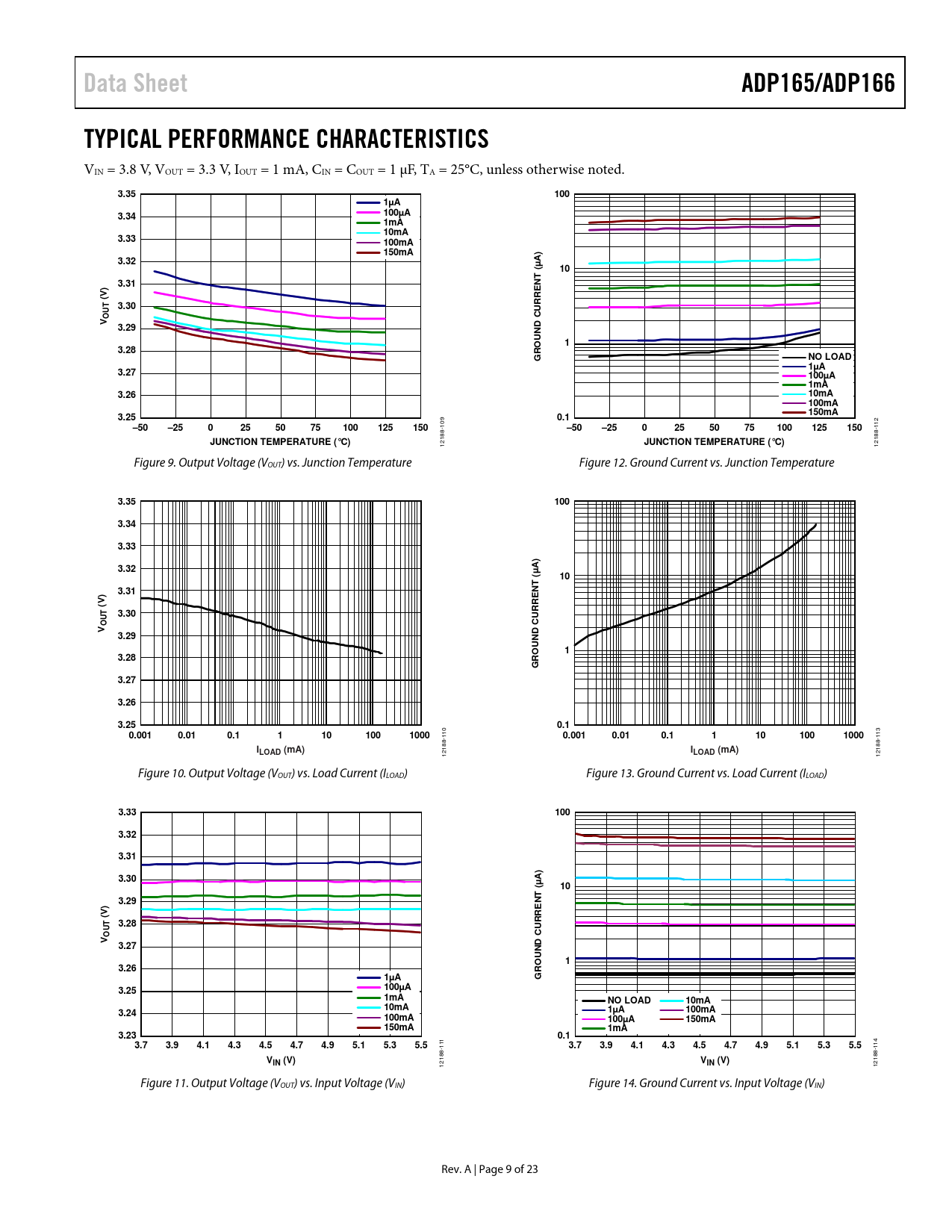 Data Sheet. ADP165/ADP166. TYPICAL PERFORMANCE CHARACTERISTICS. 3.35. 100. 1µA. 3.34. 100µA 1mA 10mA. 3.33. 100mA 150mA. 3.32. A) µ (. 3.31. (V)