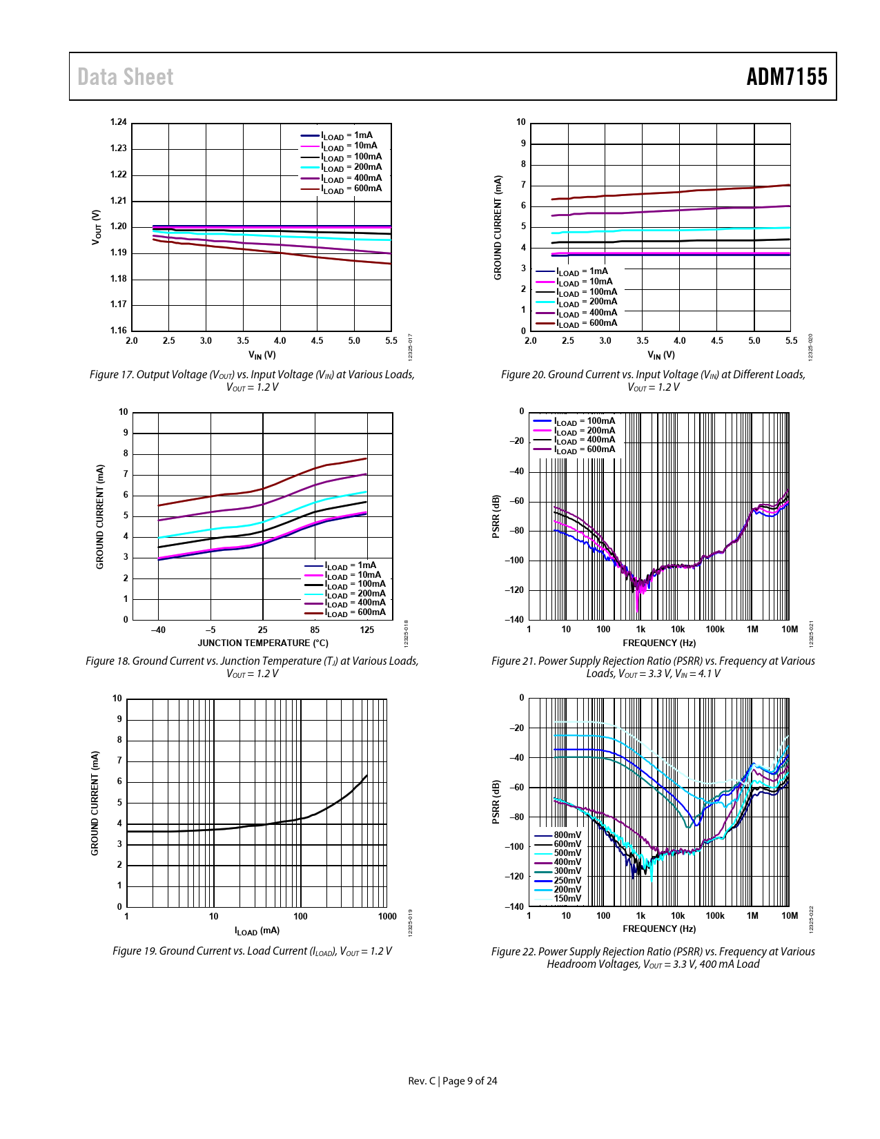 Data SheetADM71551.2410ILOAD = 1mA91.23ILOAD = 10mAILOAD = 100mAI81.22LOAD = 200mAI)LOAD = 400mAI7LOAD = 600mA(mA1.21T)N6E(V T 1.20RR5OUVCU41.19UND O3RILOAD = 1mA1.18GILOAD = 10mA2ILOAD = 100mA1.17ILOAD = 200mA1ILOAD = 400mAILOAD = 600mA1.1602.02.53.03.54.04.55.05.52.02.53.03.54.04.55.05.5 -017 -020 VIN (V)VIN (V) 12325 12325 Figure 17. Output Voltage (VOUT) vs. Input Voltage (VIN) at Various Loads, Figure 20. Ground Current vs. Input Voltage (VIN) at Different Loads, VOUT = 1.2 V VOUT = 1.2 V 100ILOAD = 100mA9ILOAD = 200mA–20ILOAD = 400mA8ILOAD = 600mAA)7–40(m T N6) B–60REd5( R–80ND CUR4PSRU O R3–100GILOAD = 1mA2ILOAD = 10mAILOAD = 100mAI–1201LOAD = 200mAILOAD = 400mAILOAD = 600mA0–140–40–52585125 18 21 0 1101001k10k100k1M10M 0 JUNCTION TEMPERATURE (°C) 325- FREQUENCY (Hz) 325- 12 12 Figure 18. Ground Current vs. Junction Temperature (TJ) at Various Loads, Figure 21. Power Supply Rejection Ratio (PSRR) vs. Frequency at Various VOUT = 1.2 V Loads, VOUT = 3.3 V, VIN = 4.1 V 1009–208) A–40m7( T N6)EB–60RR(d5R RCUPS–80ND4U800mVRO3–100600mVG500mV2400mV300mV–120250mV1200mV150mV0–1401101001000 022 019 1101001k10k100k1M10M 5- 25- ILOAD (mA)FREQUENCY (Hz) 123 1232 Figure 19. Ground Current vs. Load Current (ILOAD), VOUT = 1.2 V Figure 22. Power Supply Rejection Ratio (PSRR) vs. Frequency at Various Headroom Voltages, VOUT = 3.3 V, 400 mA Load Rev. C | Page 9 of 24 Document Outline FEATURES APPLICATIONS TYPICAL APPLICATION CIRCUIT GENERAL DESCRIPTION REVISION HISTORY SPECIFICATIONS ABSOLUTE MAXIMUM RATINGS THERMAL DATA THERMAL RESISTANCE ESD CAUTION PIN CONFIGURATIONS AND FUNCTION DESCRIPTIONS TYPICAL PERFORMANCE CHARACTERISTICS THEORY OF OPERATION APPLICATIONS INFORMATION ADIsimPOWER DESIGN TOOL CAPACITOR SELECTION Output Capacitor Input and VREG Capacitor REF Capacitor BYP Capacitor Capacitor Properties UNDERVOLTAGE LOCKOUT (UVLO) PROGRAMMABLE PRECISION ENABLE START-UP TIME REF, BYP, AND VREG PINS CURRENT-LIMIT AND THERMAL OVERLOAD PROTECTION THERMAL CONSIDERATIONS Thermal Characterization Parameter (ΨJB) PSRR PERFORMANCE PCB LAYOUT CONSIDERATIONS OUTLINE DIMENSIONS ORDERING GUIDE