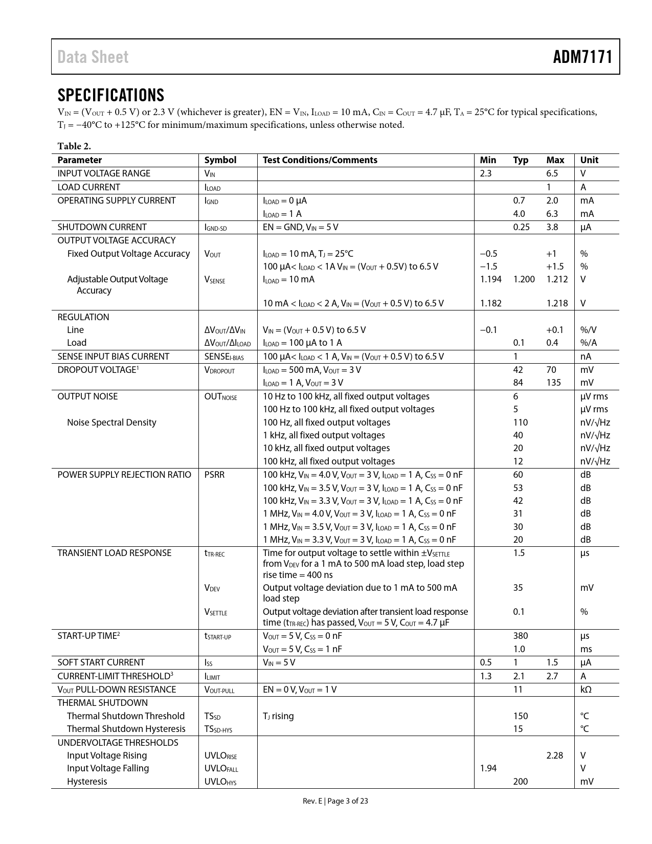 Data Sheet. ADM7171. SPECIFICATIONS. Table 2. Parameter Symbol. Test. Conditions/Comments Min. Typ. Max. Unit