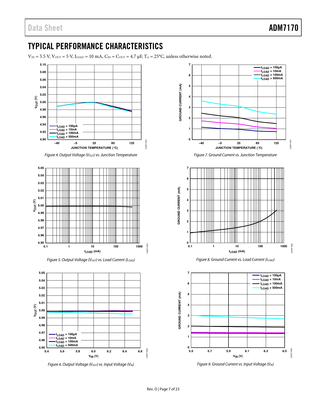 Data Sheet. ADM7170. TYPICAL PERFORMANCE CHARACTERISTICS. 5.10. ILOAD = 100µA. 5.08. ILOAD = 10mA. ILOAD = 100mA. 5.06. ILOAD = 500mA. 5.04
