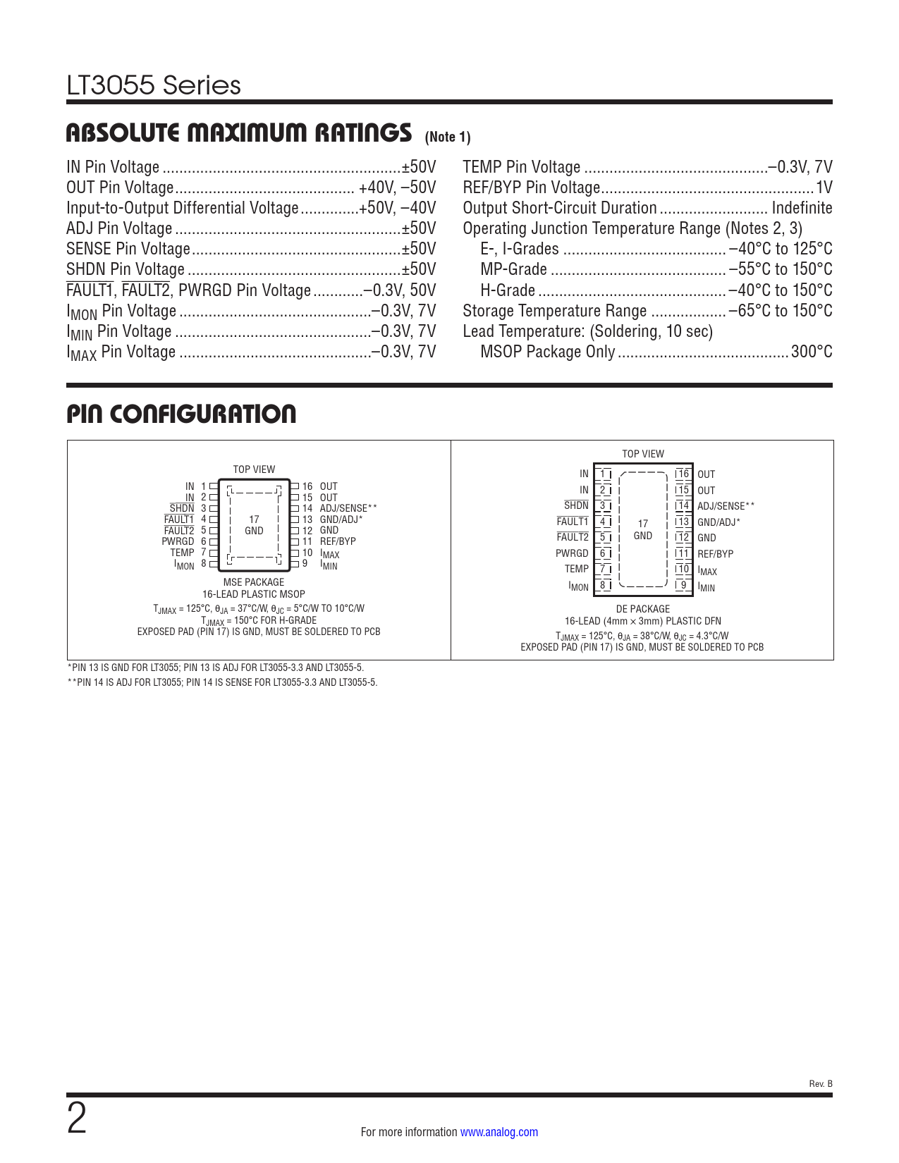 TOP VIEW TOP VIEW IN 1 16 OUT IN 1 16 OUT IN 2 15 OUT IN 2 15 OUT SHDN 3 14 ADJ/SENSE** SHDN 3 14 ADJ/SENSE** FAULT1 4 17 13 GND/ADJ* FAULT1 4 17 13 GND/ADJ* FAULT2 5 GND 12 GND PWRGD 6 11 REF/BYP FAULT2 5 GND 12 GND TEMP 7 10 IMAX PWRGD 6 11 REF/BYP I 8 MON 9 IMIN TEMP 7 10 IMAX MSE PACKAGE IMON 8 9 I 16-LEAD PLASTIC MSOP MIN TJMAX = 125°C, θJA = 37°C/W, θJC = 5°C/W TO 10°C/W DE PACKAGE TJMAX = 150°C FOR H-GRADE 16-LEAD (4mm × 3mm) PLASTIC DFN EXPOSED PAD (PIN 17) IS GND, MUST BE SOLDERED TO PCB TJMAX = 125°C, θJA = 38°C/W, θJC = 4.3°C/W EXPOSED PAD (PIN 17) IS GND, MUST BE SOLDERED TO PCB *PIN 13 IS GND FOR LT3055; PIN 13 IS ADJ FOR LT3055-3.3 AND LT3055-5. **PIN 14 IS ADJ FOR LT3055; PIN 14 IS SENSE FOR LT3055-3.3 AND LT3055-5. Rev. B 2 For more information www.analog.com Document Outline Features Applications Description Typical Application Absolute Maximum Ratings Pin Configuration Order Information Electrical Characteristics Typical Performance Characteristics Pin Functions Block Diagram Operation Applications Information Package Description Revision History Typical Application Related Parts
