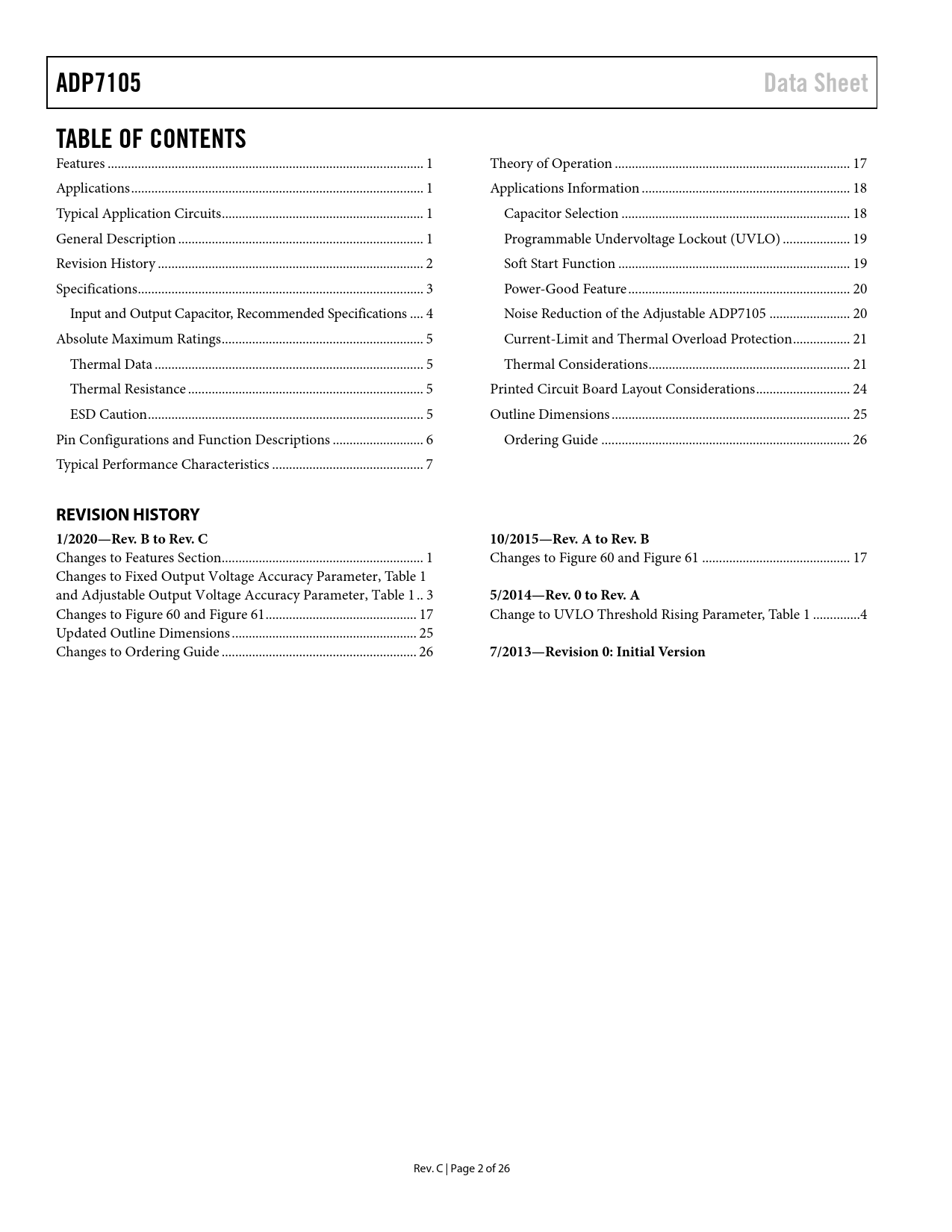 link to page 1 link to page 1 link to page 1 link to page 1 link to page 2 link to page 3 link to page 4 link to page 5 link to page 5 link to page 5 link to page 5 link to page 6 link to page 7 link to page 17 link to page 18 link to page 18 link to page 19 link to page 19 link to page 20 link to page 20 link to page 21 link to page 21 link to page 24 link to page 25 link to page 26 ADP7105Data SheetTABLE OF CONTENTS Features .. 1 Theory of Operation .. 17 Applications ... 1 Applications Information .. 18 Typical Application Circuits .. 1 Capacitor Selection .. 18 General Description ... 1 Programmable Undervoltage Lockout (UVLO) .. 19 Revision History ... 2 Soft Start Function ... 19 Specifications ... 3 Power-Good Feature .. 20 Input and Output Capacitor, Recommended Specifications .. 4 Noise Reduction of the Adjustable ADP7105 .. 20 Absolute Maximum Ratings .. 5 Current-Limit and Thermal Overload Protection ... 21 Thermal Data .. 5 Thermal Considerations .. 21 Thermal Resistance .. 5 Printed Circuit Board Layout Considerations .. 24 ESD Caution .. 5 Outline Dimensions ... 25 Pin Configurations and Function Descriptions ... 6 Ordering Guide .. 26 Typical Performance Characteristics ... 7 REVISION HISTORY 1/2020—Rev. B to Rev. C10/2015—Rev. A to Rev. B Changes to Features Section.. 1 Changes to Figure 60 and Figure 61 .. 17 Changes to Fixed Output Voltage Accuracy Parameter, Table 1 and Adjustable Output Voltage Accuracy Parameter, Table 1 .. 3 5/2014—Rev. 0 to Rev. A Changes to Figure 60 and Figure 61 ... 17 Change to UVLO Threshold Rising Parameter, Table 1 .. 4 Updated Outline Dimensions ... 25 Changes to Ordering Guide .. 26 7/2013—Revision 0: Initial Version Rev. C | Page 2 of 26 Document Outline Features Applications Typical Application Circuits General Description Table of Contents Revision History Specifications Input and Output Capacitor, Recommended Specifications Absolute Maximum Ratings Thermal Data Thermal Resistance ESD Caution Pin Configurations and Function Descriptions Typical Performance Characteristics Theory of Operation Applications Information Capacitor Selection Output Capacitor Input Bypass Capacitor Input and Output Capacitor Properties Programmable Undervoltage Lockout (UVLO) Soft Start Function Power-Good Feature Noise Reduction of the Adjustable ADP7105 Current-Limit and Thermal Overload Protection Thermal Considerations Printed Circuit Board Layout Considerations Outline Dimensions Ordering Guide