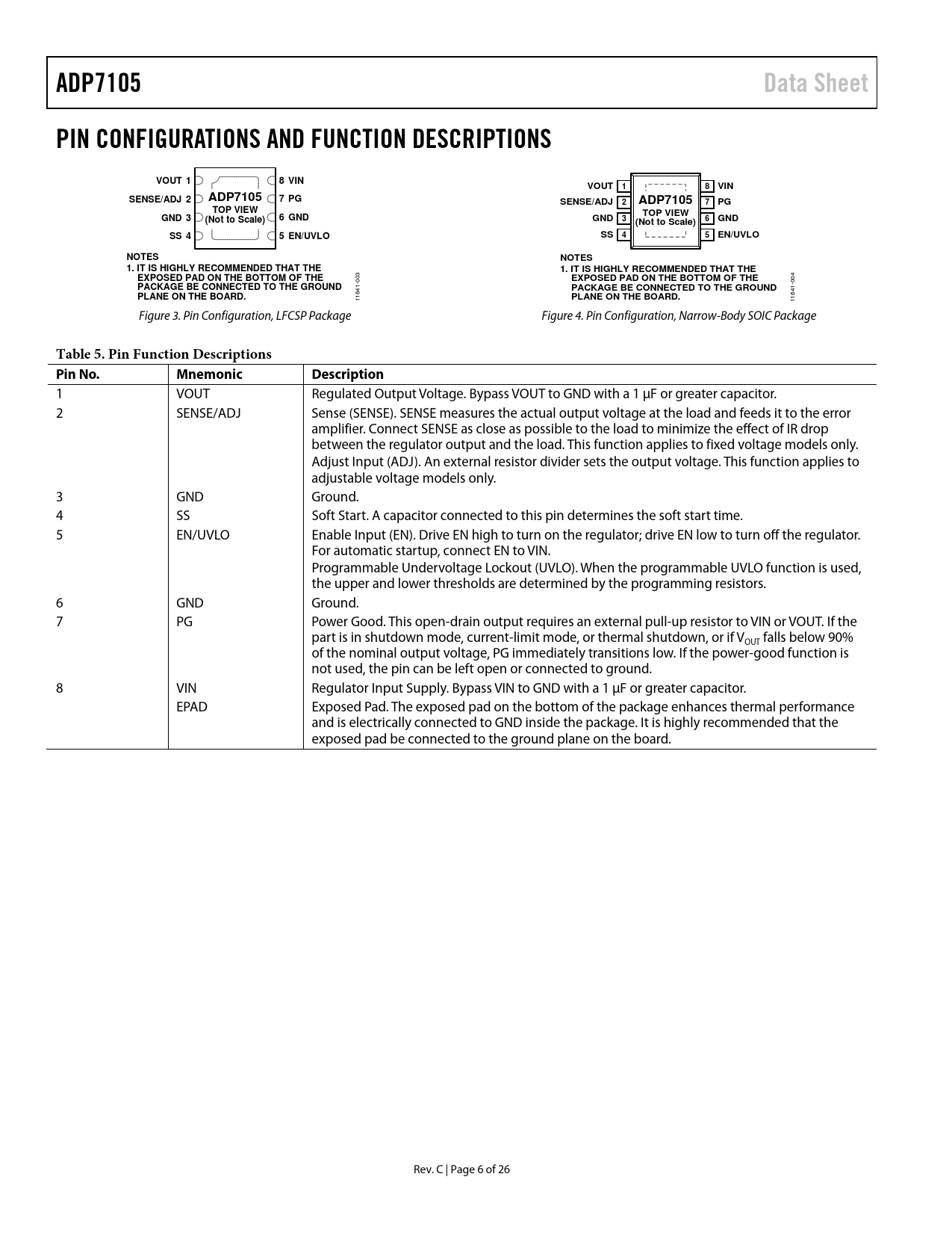 Páginas / Página26 / 6 — ADP7105. Data Sheet. PIN CONFIGURATIONS AND FUNCTION DESCRIPTIONS. VOUT …