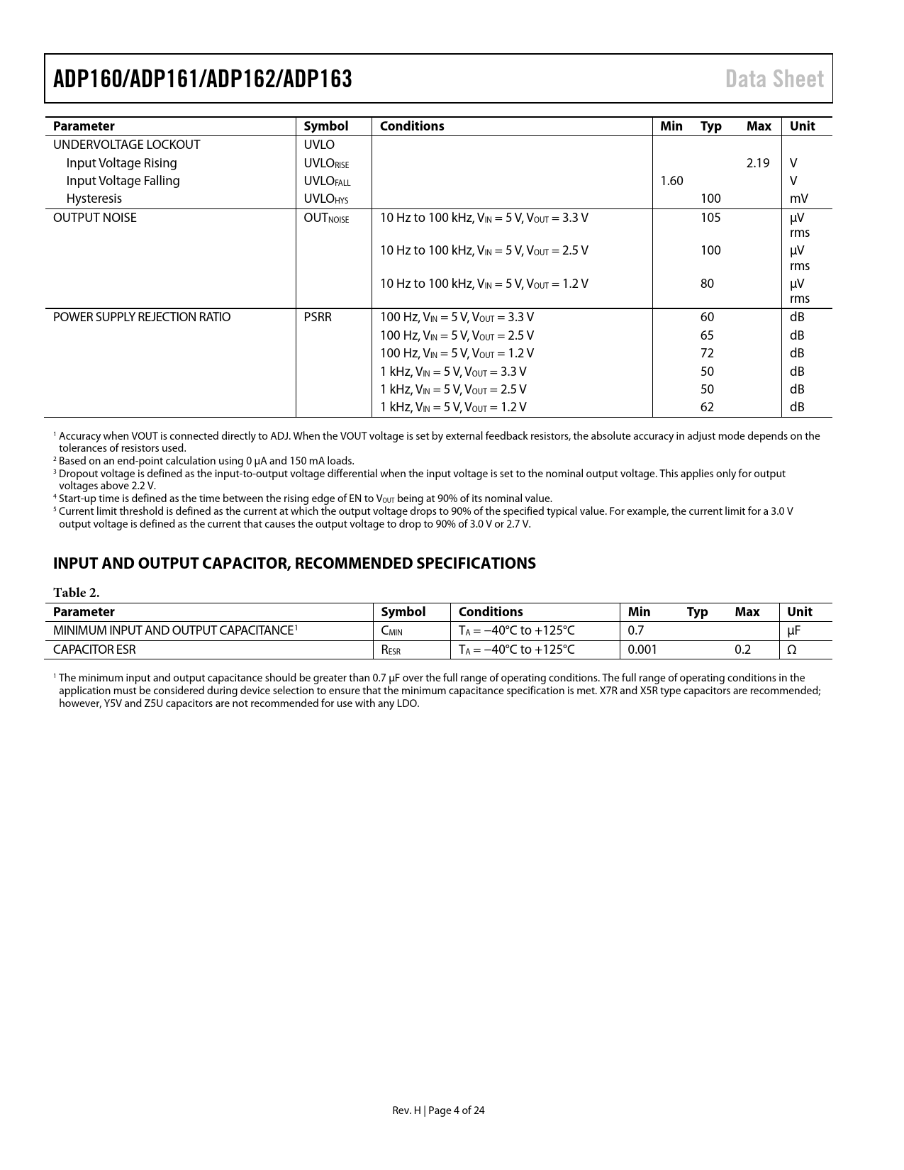 link to page 4 ADP160/ADP161/ADP162/ADP163Data SheetParameterSymbolConditionsMin TypMaxUnit UNDERVOLTAGE LOCKOUT UVLO Input Voltage Rising UVLORISE 2.19 V Input Voltage Falling UVLOFALL 1.60 V Hysteresis UVLOHYS 100 mV OUTPUT NOISE OUTNOISE 10 Hz to 100 kHz, VIN = 5 V, VOUT = 3.3 V 105 µV rms 10 Hz to 100 kHz, VIN = 5 V, VOUT = 2.5 V 100 µV rms 10 Hz to 100 kHz, VIN = 5 V, VOUT = 1.2 V 80 µV rms POWER SUPPLY REJECTION RATIO PSRR 100 Hz, VIN = 5 V, VOUT = 3.3 V 60 dB 100 Hz, VIN = 5 V, VOUT = 2.5 V 65 dB 100 Hz, VIN = 5 V, VOUT = 1.2 V 72 dB 1 kHz, VIN = 5 V, VOUT = 3.3 V 50 dB 1 kHz, VIN = 5 V, VOUT = 2.5 V 50 dB 1 kHz, VIN = 5 V, VOUT = 1.2 V 62 dB 1 Accuracy when VOUT is connected directly to ADJ. When the VOUT voltage is set by external feedback resistors, the absolute accuracy in adjust mode depends on the tolerances of resistors used. 2 Based on an end-point calculation using 0 μA and 150 mA loads. 3 Dropout voltage is defined as the input-to-output voltage differential when the input voltage is set to the nominal output voltage. This applies only for output voltages above 2.2 V. 4 Start-up time is defined as the time between the rising edge of EN to VOUT being at 90% of its nominal value. 5 Current limit threshold is defined as the current at which the output voltage drops to 90% of the specified typical value. For example, the current limit for a 3.0 V output voltage is defined as the current that causes the output voltage to drop to 90% of 3.0 V or 2.7 V. INPUT AND OUTPUT CAPACITOR, RECOMMENDED SPECIFICATIONSTable 2. ParameterSymbolConditionsMinTypMaxUnit MINIMUM INPUT AND OUTPUT CAPACITANCE1 CMIN TA = −40°C to +125°C 0.7 µF CAPACITOR ESR RESR TA = −40°C to +125°C 0.001 0.2 Ω 1 The minimum input and output capacitance should be greater than 0.7 µF over the full range of operating conditions. The full range of operating conditions in the application must be considered during device selection to ensure that the minimum capacitance specification is met. X7R and X5R type capacitors are recommended; however, Y5V and Z5U capacitors are not recommended for use with any LDO. Rev. H | Page 4 of 24 Document Outline Features Applications Typical Application Circuits General Description Table of Contents Revision History Specifications Input and Output Capacitor, Recommended Specifications Absolute Maximum Ratings Thermal Data Thermal Resistance ESD Caution Pin Configurations and Function Descriptions Typical Performance Characteristics Theory of Operation Applications Information Capacitor Selection Output Capacitor Input Bypass Capacitor Input and Output Capacitor Properties Enable Feature Current Limit and Thermal Overload Protection Thermal Considerations PCB Layout Considerations Light Sensitivity of WLCSPs Outline Dimensions Ordering Guide