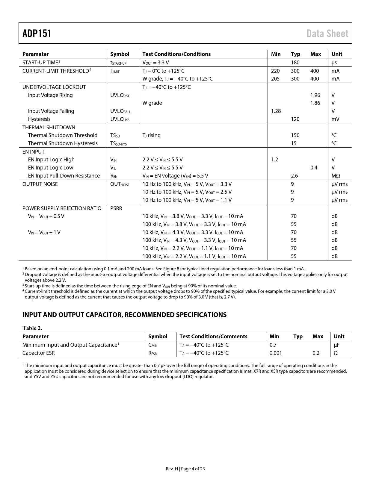 Páginas / Página23 / 4 — ADP151. Data Sheet. Parameter. Symbol. Test Conditions/Conditions. Min. …