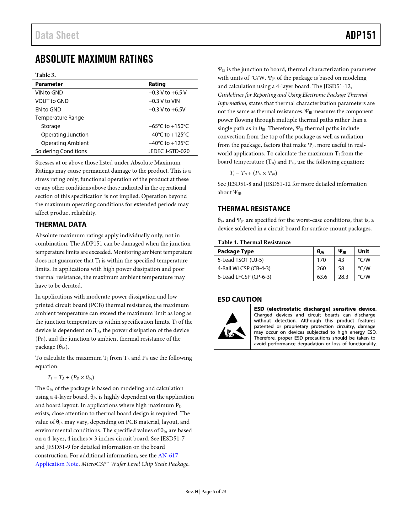 Data Sheet ADP151 ABSOLUTE MAXIMUM RATINGS Table 3 Parameter Rating THERMAL RESISTANCE THERMAL DATA Table 4 Thermal Resistance