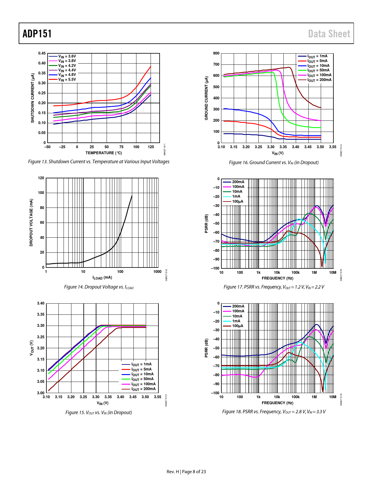 08627- 08627- Figure 14. Dropout Voltage vs. ILOAD Figure 17. PSRR vs. Frequency, VOUT = 1.2 V, VIN = 2.2 V