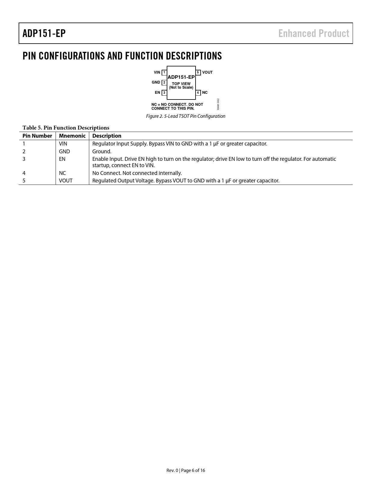 ADP151-EPEnhanced ProductPIN CONFIGURATIONS AND FUNCTION DESCRIPTIONSVIN 15VOUTADP151-EPGND 2TOP VIEW(Not to Scale)EN 34NC 002 NC = NO CONNECT. DO NOT CONNECT TO THIS PIN. 10681- Figure 2. 5-Lead TSOT Pin Configuration Table 5. Pin Function Descriptions Pin Number Mnemonic Description 1 VIN Regulator Input Supply. Bypass VIN to GND with a 1 µF or greater capacitor. 2 GND Ground. 3 EN Enable Input. Drive EN high to turn on the regulator; drive EN low to turn off the regulator. For automatic startup, connect EN to VIN. 4 NC No Connect. Not connected internally. 5 VOUT Regulated Output Voltage. Bypass VOUT to GND with a 1 µF or greater capacitor. Rev. 0 | Page 6 of 16 Document Outline Features Applications Typical Application Circuit General Description Revision History Specifications Input and Output Capacitor, Recommended Specifications Absolute Maximum Ratings Thermal Data Thermal Resistance ESD Caution Pin Configurations and Function Descriptions Typical Performance Characteristics Applications Information Thermal Considerations Printed Circuit Board Layout Considerations Outline Dimensions Ordering Guide