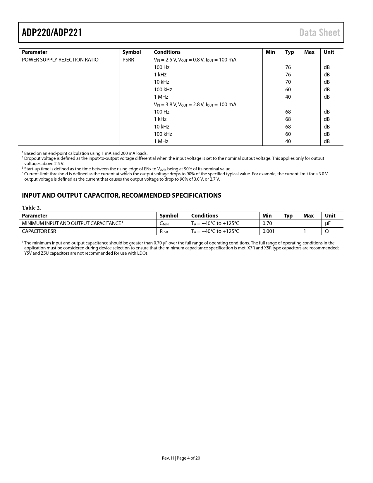 POWER SUPPLY REJECTION RATIO PSRR VIN = 2.5 V, VOUT = 0.8 V, IOUT = 100 mA 100 Hz 76 dB 1 kHz 76 dB 10 kHz 70 dB 100 kHz 60 dB 1 MHz 40 dB VIN = 3.8 V, VOUT = 2.8 V, IOUT = 100 mA 100 Hz 68 dB 1 kHz 68 dB 10 kHz 68 dB 100 kHz 60 dB 1 MHz 40 dB 1 Based on an end-point calculation using 1 mA and 200 mA loads. 2 Dropout voltage is defined as the input-to-output voltage differential when the input voltage is set to the nominal output voltage. This applies only for output voltages above 2.5 V. 3 Start-up time is defined as the time between the rising edge of ENx to VOUTx being at 90% of its nominal value. 4 Current-limit threshold is defined as the current at which the output voltage drops to 90% of the specified typical value. For example, the current limit for a 3.0 V output voltage is defined as the current that causes the output voltage to drop to 90% of 3.0 V, or 2.7 V.
