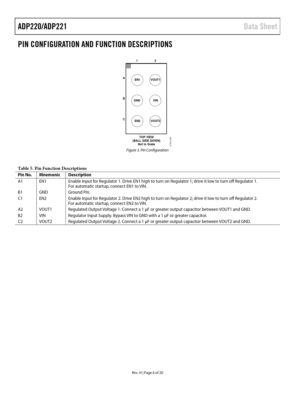 ADP220/ADP221Data SheetPIN CONFIGURATION AND FUNCTION DESCRIPTIONS12AEN1VOUT1BGNDVINCEN2VOUT2TOP VIEW(BALL SIDE DOWN) 003 Not to Scale 07572- Figure 3. Pin Configuration Table 5. Pin Function Descriptions Pin No.MnemonicDescription A1 EN1 Enable Input for Regulator 1. Drive EN1 high to turn on Regulator 1; drive it low to turn off Regulator 1. For automatic startup, connect EN1 to VIN. B1 GND Ground Pin. C1 EN2 Enable Input for Regulator 2. Drive EN2 high to turn on Regulator 2; drive it low to turn off Regulator 2. For automatic startup, connect EN2 to VIN. A2 VOUT1 Regulated Output Voltage 1. Connect a 1 µF or greater output capacitor between VOUT1 and GND. B2 VIN Regulator Input Supply. Bypass VIN to GND with a 1 µF or greater capacitor. C2 VOUT2 Regulated Output Voltage 2. Connect a 1 µF or greater output capacitor between VOUT2 and GND. Rev. H | Page 6 of 20 Document Outline Features Applications Typical Application Circuits General Description Table of Contents Revision History Specifications Input and Output Capacitor, Recommended Specifications Absolute Maximum Ratings Thermal Data Thermal Resistance ESD Caution Pin Configuration and Function Descriptions Typical Performance Characteristics Theory of Operation Applications Information Capacitor Selection Output Capacitor Input Bypass Capacitor Input and Output Capacitor Properties Undervoltage Lockout Enable Feature Current-Limit and Thermal Overload Protection Thermal Considerations Printed Circuit Board (PCB) Layout Considerations Outline Dimensions Ordering Guide