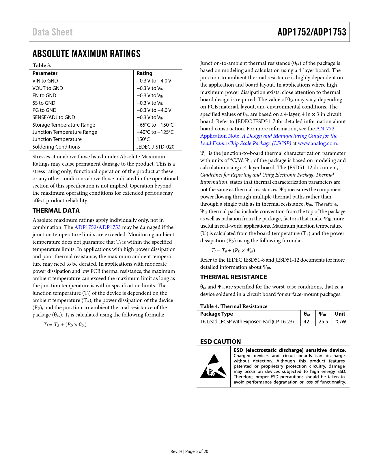 Data Sheet. ADP1752/ADP1753. ABSOLUTE MAXIMUM RATINGS Table 3. Parameter. Rating. THERMAL DATA. THERMAL RESISTANCE