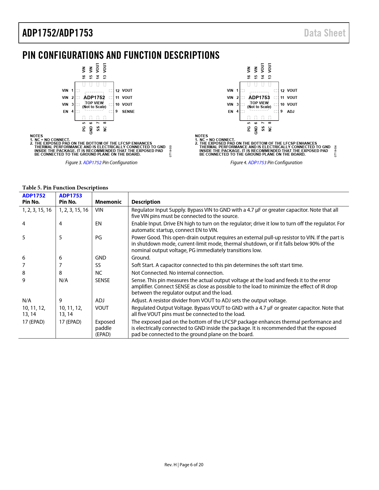 Páginas / Página20 / 6 — ADP1752/ADP1753. Data Sheet. PIN CONFIGURATIONS AND FUNCTION …