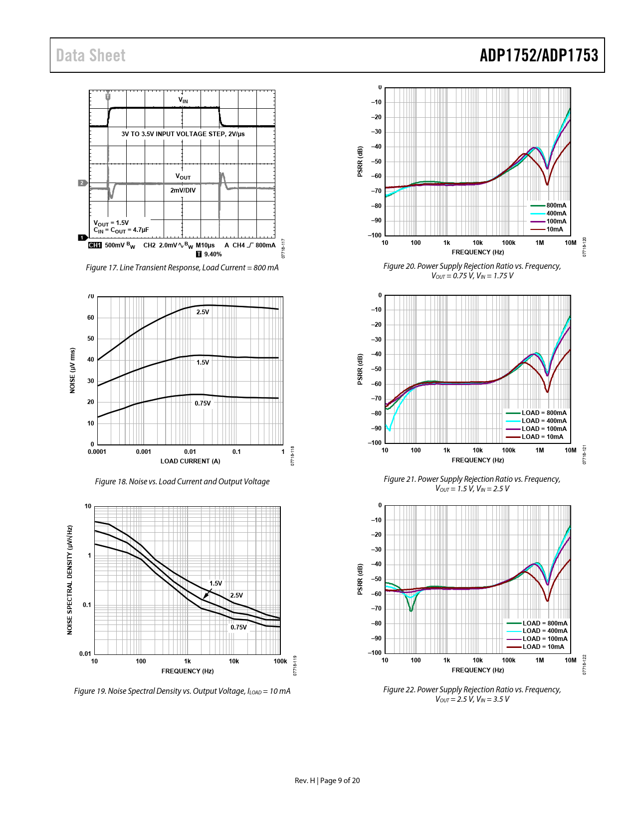 Data Sheet. ADP1752/ADP1753. VIN. –10. –20. 3V TO 3.5V INPUT VOLTAGE STEP, 2V/µs. –30. –40. dB). –50. VOUT. PSRR (. –60. 2mV/DIV. –70. –80. 800mA. 400mA