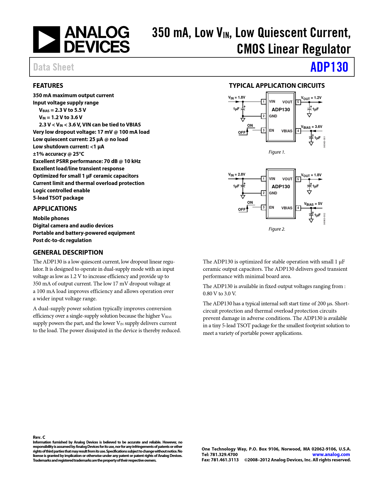 350 mA, Low VIN, Low Quiescent Current,. CMOS Linear Regulator. Data Sheet. ADP130. FEATURES. TYPICAL APPLICATION CIRCUITS