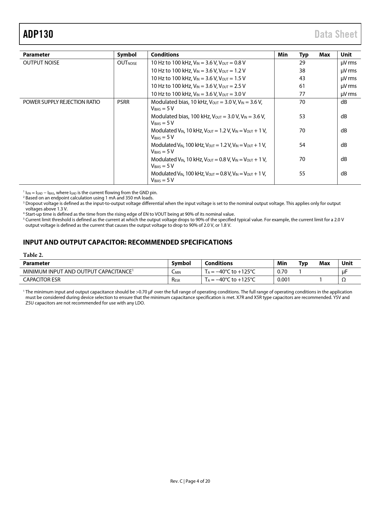 link to page 4 ADP130Data SheetParameterSymbol ConditionsMin Typ Max Unit OUTPUT NOISE OUTNOISE 10 Hz to 100 kHz, VIN = 3.6 V, VOUT = 0.8 V 29 μV rms 10 Hz to 100 kHz, VIN = 3.6 V, VOUT = 1.2 V 38 μV rms 10 Hz to 100 kHz, VIN = 3.6 V, VOUT = 1.5 V 43 μV rms 10 Hz to 100 kHz, VIN = 3.6 V, VOUT = 2.5 V 61 μV rms 10 Hz to 100 kHz, VIN = 3.6 V, VOUT = 3.0 V 77 μV rms POWER SUPPLY REJECTION RATIO PSRR Modulated bias, 10 kHz, VOUT = 3.0 V, VIN = 3.6 V, 70 dB VBIAS = 5 V Modulated bias, 100 kHz, VOUT = 3.0 V, VIN = 3.6 V, 53 dB VBIAS = 5 V Modulated VIN, 10 kHz, VOUT = 1.2 V, VIN = VOUT + 1 V, 70 dB VBIAS = 5 V Modulated VIN, 100 kHz, VOUT = 1.2 V, VIN = VOUT + 1 V, 54 dB VBIAS = 5 V Modulated VIN, 10 kHz, VOUT = 0.8 V, VIN = VOUT + 1 V, 70 dB VBIAS = 5 V Modulated VIN, 100 kHz, VOUT = 0.8 V, VIN = VOUT + 1 V, 55 dB VBIAS = 5 V 1 IVIN = IGND − IBIAS, where IGND is the current flowing from the GND pin. 2 Based on an endpoint calculation using 1 mA and 350 mA loads. 3 Dropout voltage is defined as the input-to-output voltage differential when the input voltage is set to the nominal output voltage. This applies only for output voltages above 1.3 V. 4 Start-up time is defined as the time from the rising edge of EN to VOUT being at 90% of its nominal value. 5 Current limit threshold is defined as the current at which the output voltage drops to 90% of the specified typical value. For example, the current limit for a 2.0 V output voltage is defined as the current that causes the output voltage to drop to 90% of 2.0 V, or 1.8 V. INPUT AND OUTPUT CAPACITOR: RECOMMENDED SPECIFICATIONSTable 2. ParameterSymbol ConditionsMin Typ Max Unit MINIMUM INPUT AND OUTPUT CAPACITANCE1 CMIN TA = −40°C to +125°C 0.70 1 μF CAPACITOR ESR RESR TA = −40°C to +125°C 0.001 1 Ω 1 The minimum input and output capacitance should be >0.70 μF over the full range of operating conditions. The full range of operating conditions in the application must be considered during device selection to ensure that the minimum capacitance specification is met. X7R and X5R type capacitors are recommended. Y5V and Z5U capacitors are not recommended for use with any LDO. Rev. C | Page 4 of 20 Document Outline Features Applications Typical Application Circuits General Description Table of Contents Revision History Specifications Input and Output Capacitor: Recommended Specifications Absolute Maximum Ratings Thermal Data Thermal Resistance ESD Caution Pin Configuration and Function Descriptions Typical Performance Characteristics Theory of Operation Applications Information Capacitor Selection Output Capacitor Input Bypass Capacitor Bias Capacitor Input, Bias, and Output Capacitor Properties Undervoltage Lockout Enable Feature Current Limit and Thermal Overload Protection Thermal Considerations Junction Temperature Calculations PCB Layout Considerations Outline Dimensions Ordering Guide