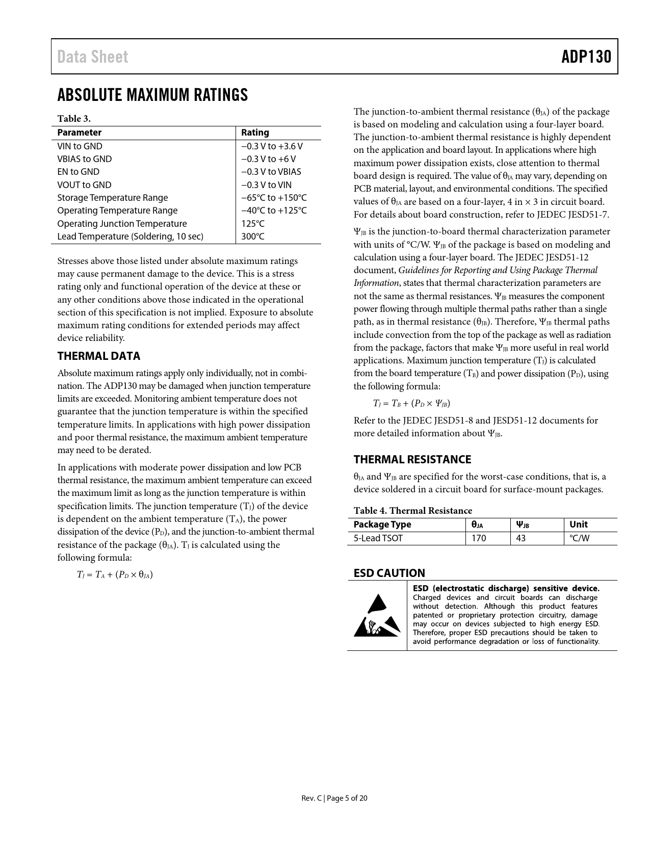 Data Sheet ADP130 ABSOLUTE MAXIMUM RATINGS Table 3 Parameter Rating THERMAL DATA THERMAL RESISTANCE