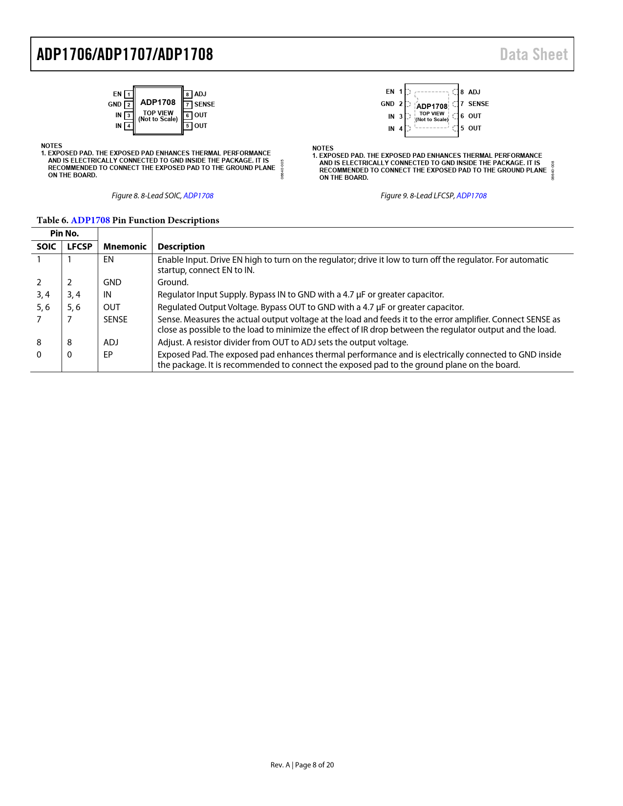 ADP1706/ADP1707/ADP1708. Data Sheet. EN 1. 8 ADJ. GND 2. ADP1708. 7 SENSE. IN 3. TOP VIEW. 6 OUT. (Not to Scale). IN 4. 5 OUT. NOTES