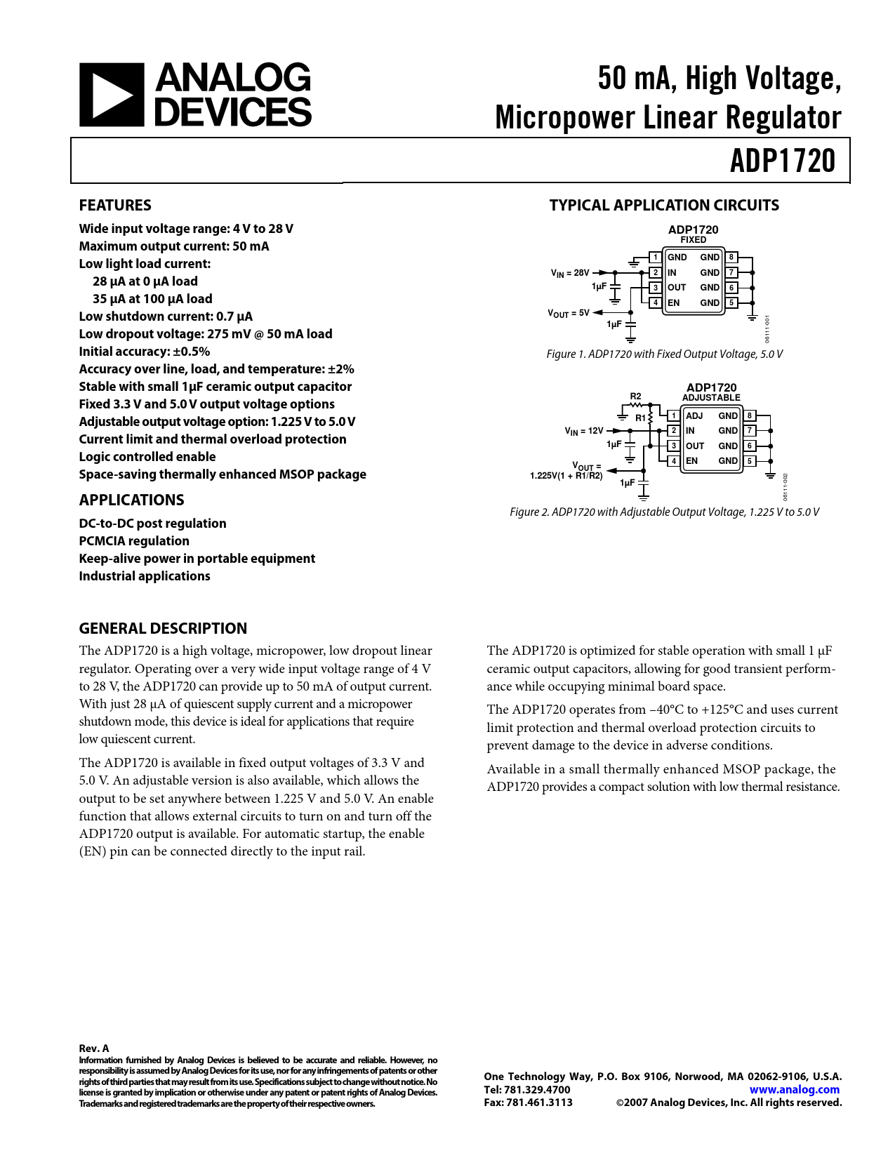 The ADP1720 is a high voltage, micropower, low dropout linear The ADP1720 is optimized for stable operation with small 1 μF regulator. Operating over a very wide input voltage range of 4 V ceramic output capacitors, allowing for good transient perform- to 28 V, the ADP1720 can provide up to 50 mA of output current. ance while occupying minimal board space. With just 28 μA of quiescent supply current and a micropower The ADP1720 operates from –40°C to +125°C and uses current shutdown mode, this device is ideal for applications that require limit protection and thermal overload protection circuits to low quiescent current. prevent damage to the device in adverse conditions. The ADP1720 is available in fixed output voltages of 3.3 V and Available in a small thermally enhanced MSOP package, the 5.0 V. An adjustable version is also available, which allows the ADP1720 provides a compact solution with low thermal resistance. output to be set anywhere between 1.225 V and 5.0 V. An enable function that allows external circuits to turn on and turn off the ADP1720 output is available. For automatic startup, the enable (EN) pin can be connected directly to the input rail.