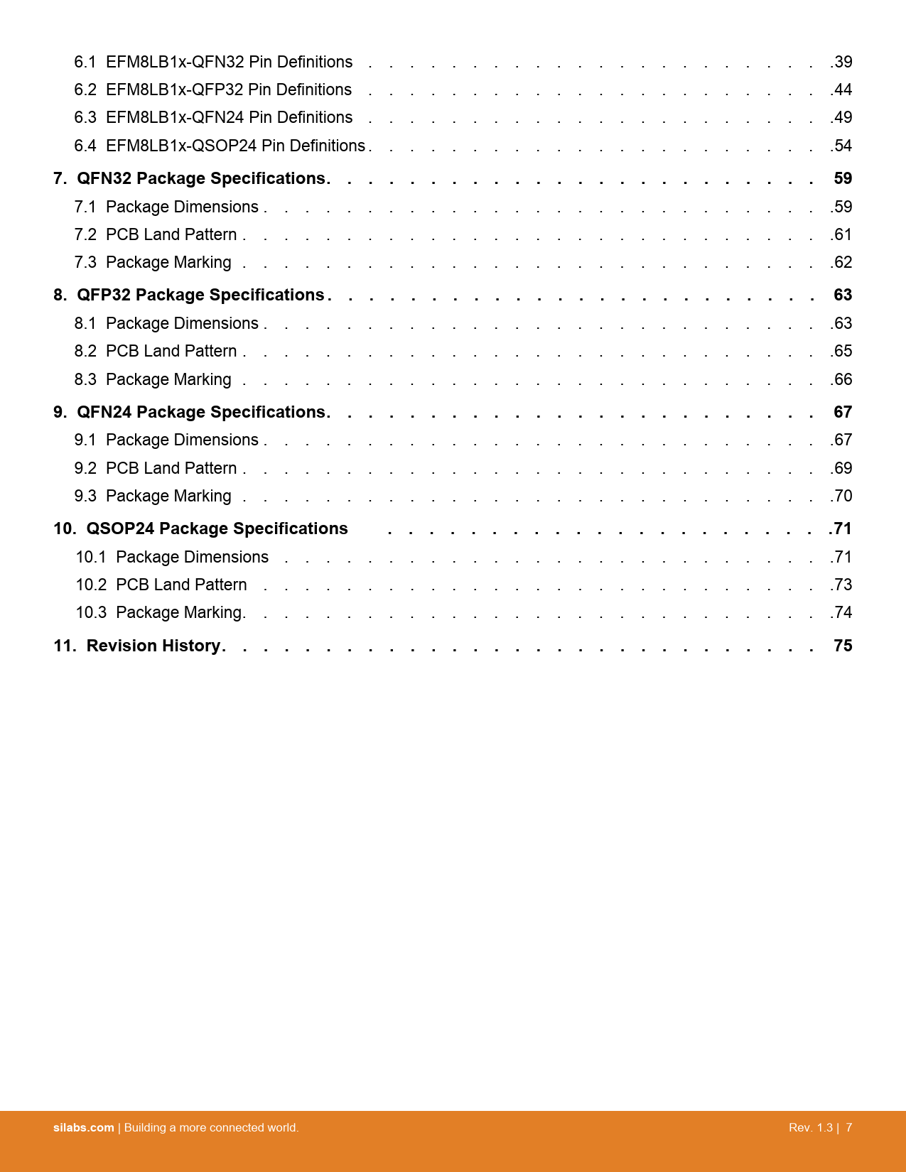 | Building a more connected world. Rev. 1.3 | 7 Document Outline 1. Feature List 2. Ordering Information 3. System Overview 3.1 Introduction 3.2 Power 3.3 I/O 3.4 Clocking 3.5 Counters/Timers and PWM 3.6 Communications and Other Digital Peripherals 3.7 Analog 3.8 Reset Sources 3.9 Debugging 3.10 Bootloader 4. Electrical Specifications 4.1 Electrical Characteristics 4.1.1 Recommended Operating Conditions 4.1.2 Power Consumption 4.1.3 Reset and Supply Monitor 4.1.4 Flash Memory 4.1.5 Power Management Timing 4.1.6 Internal Oscillators 4.1.7 External Clock Input 4.1.8 External Oscillator 4.1.9 ADC 4.1.10 Voltage Reference 4.1.11 Temperature Sensor 4.1.12 1.8 V Internal LDO Voltage Regulator 4.1.13 DACs 4.1.14 Comparators 4.1.15 Configurable Logic 4.1.16 Port I/O 4.1.17 SMBus 4.2 Thermal Conditions 4.3 Absolute Maximum Ratings 5. Typical Connection Diagrams 5.1 Power 5.2 Debug 5.3 Other Connections 6. Pin Definitions 6.1 EFM8LB1x-QFN32 Pin Definitions 6.2 EFM8LB1x-QFP32 Pin Definitions 6.3 EFM8LB1x-QFN24 Pin Definitions 6.4 EFM8LB1x-QSOP24 Pin Definitions 7. QFN32 Package Specifications 7.1 Package Dimensions 7.2 PCB Land Pattern 7.3 Package Marking 8. QFP32 Package Specifications 8.1 Package Dimensions 8.2 PCB Land Pattern 8.3 Package Marking 9. QFN24 Package Specifications 9.1 Package Dimensions 9.2 PCB Land Pattern 9.3 Package Marking 10. QSOP24 Package Specifications 10.1 Package Dimensions 10.2 PCB Land Pattern 10.3 Package Marking 11. Revision History