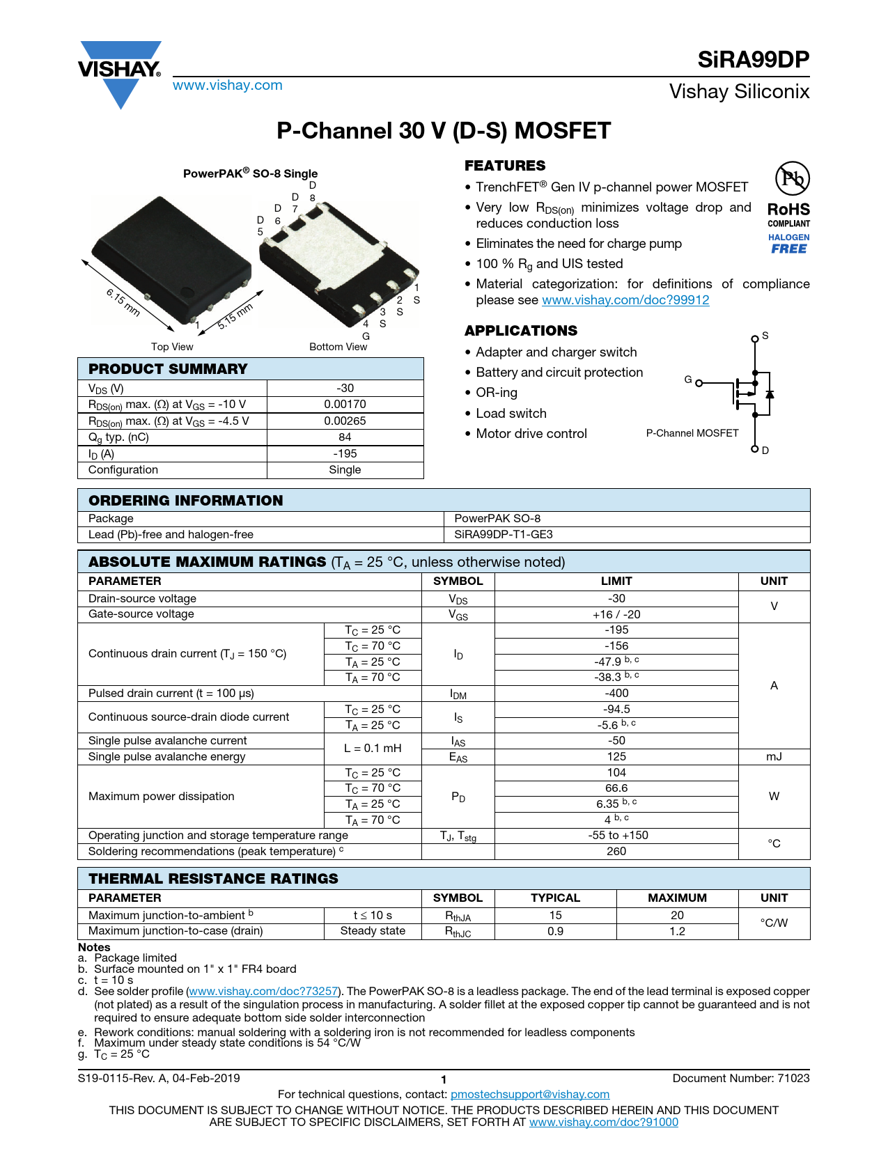SiRA99DP www.vishay.com Vishay Siliconix P-Channel 30 V (D-S) MOSFETFEATURESPowerPAK® SO-8 Single D • TrenchFET® Gen IV p-channel power MOSFET D 8 D 7 • Very low RDS(on) minimizes voltage drop and D 6 reduces conduction loss 5 • Eliminates the need for charge pump • 100 % Rg and UIS tested • Material categorization: for definitions of compliance 6.15 mm 1 2 S please see www.vishay.com/doc?99912 3 S 1 5.15 mm 4 S APPLICATIONS G S Top View Bottom View • Adapter and charger switch PRODUCT SUMMARY • Battery and circuit protection G VDS (V) -30 • OR-ing RDS(on) max. () at VGS = -10 V 0.00170 • Load switch RDS(on) max. () at VGS = -4.5 V 0.00265 • Motor drive control Q P-Channel MOSFET g typ. (nC) 84 I D D (A) -195 Configuration Single ORDERING INFORMATION Package PowerPAK SO-8 Lead (Pb)-free and halogen-free SiRA99DP-T1-GE3 ABSOLUTE MAXIMUM RATINGS (TA = 25 °C, unless otherwise noted) PARAMETERSYMBOL LIMITUNIT Drain-source voltage VDS -30 V Gate-source voltage VGS +16 / -20 TC = 25 °C -195 T Continuous drain current (T C = 70 °C -156 J = 150 °C) ID TA = 25 °C -47.9 b, c TA = 70 °C -38.3 b, c A Pulsed drain current (t = 100 μs) IDM -400 T -94.5 Continuous source-drain diode current C = 25 °C IS TA = 25 °C -5.6 b, c Single pulse avalanche current I L = 0.1 mH AS -50 Single pulse avalanche energy EAS 125 mJ TC = 25 °C 104 T Maximum power dissipation C = 70 °C 66.6 PD W TA = 25 °C 6.35 b, c TA = 70 °C 4 b, c Operating junction and storage temperature range TJ, Tstg -55 to +150 °C Soldering recommendations (peak temperature) c 260 THERMAL RESISTANCE RATINGSPARAMETERSYMBOL TYPICALMAXIMUMUNIT Maximum junction-to-ambient b t 10 s RthJA 15 20 °C/W Maximum junction-to-case (drain) Steady state RthJC 0.9 1.2 Notes a. Package limited b. Surface mounted on 1" x 1" FR4 board c. t = 10 s d. See solder profile (www.vishay.com/doc?73257). The PowerPAK SO-8 is a leadless package. The end of the lead terminal is exposed copper (not plated) as a result of the singulation process in manufacturing. A solder fillet at the exposed copper tip cannot be guaranteed and is not required to ensure adequate bottom side solder interconnection e. Rework conditions: manual soldering with a soldering iron is not recommended for leadless components f. Maximum under steady state conditions is 54 °C/W g. TC = 25 °C S19-0115-Rev. A, 04-Feb-2019 1 Document Number: 71023 For technical questions, contact: pmostechsupport@vishay.com THIS DOCUMENT IS SUBJECT TO CHANGE WITHOUT NOTICE. THE PRODUCTS DESCRIBED HEREIN AND THIS DOCUMENT ARE SUBJECT TO SPECIFIC DISCLAIMERS, SET FORTH AT www.vishay.com/doc?91000