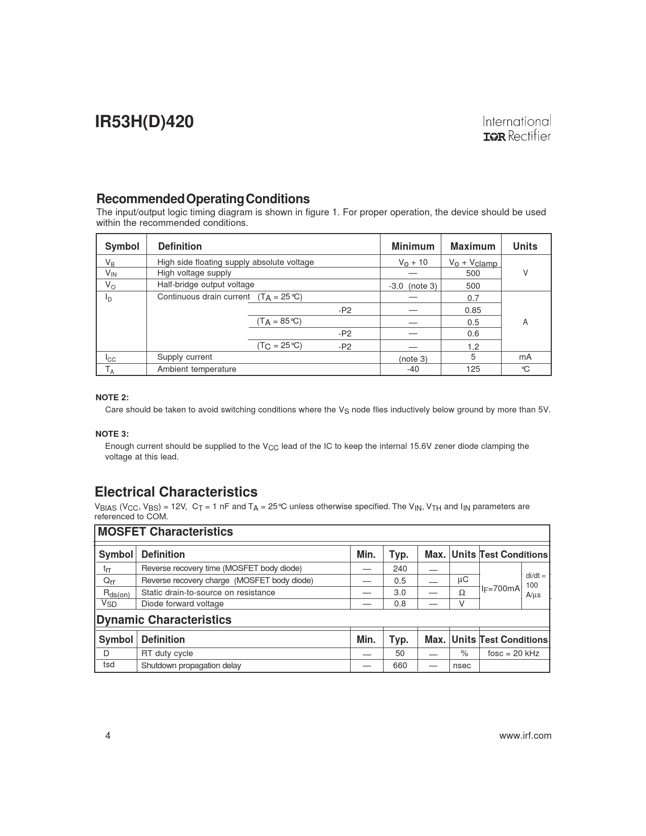 IR53H(D)420. Recommended Operating Conditions. Symbol Definition. Minimum. Maximum. Units. NOTE 2:. NOTE 3:. Electrical Characteristics