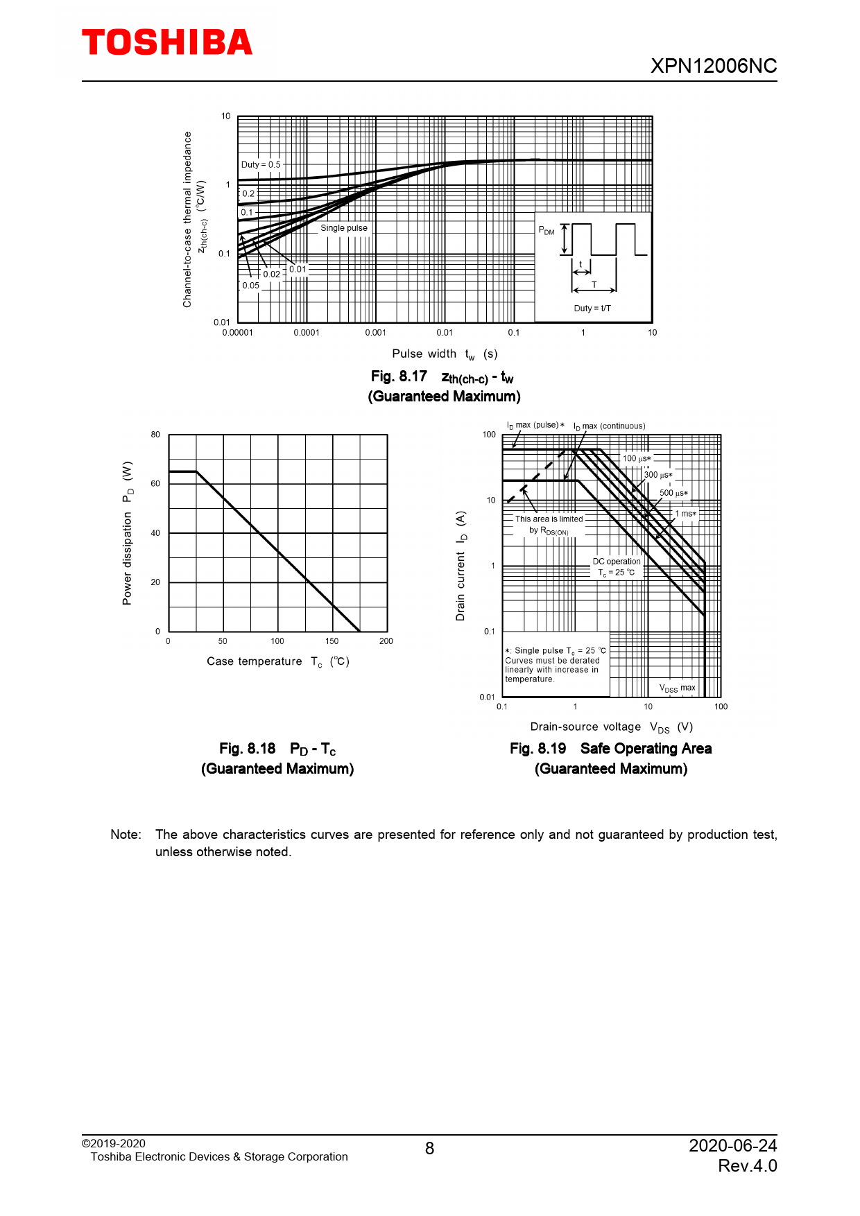 XPN12006NC Fig. 8.17 zth(ch-c) - tw (Guaranteed Maximum) Fig. 8.18 PD - Tc Fig. 8.19 Safe Operating Area (Guaranteed Maximum) (Guaranteed Maximum) Note: The above characteristics curves are presented for reference only and not guaranteed by production test, unless otherwise noted. ©2019-2020 8 2020-06-24 Toshiba Electronic Devices & Storage Corporation Rev.4.0