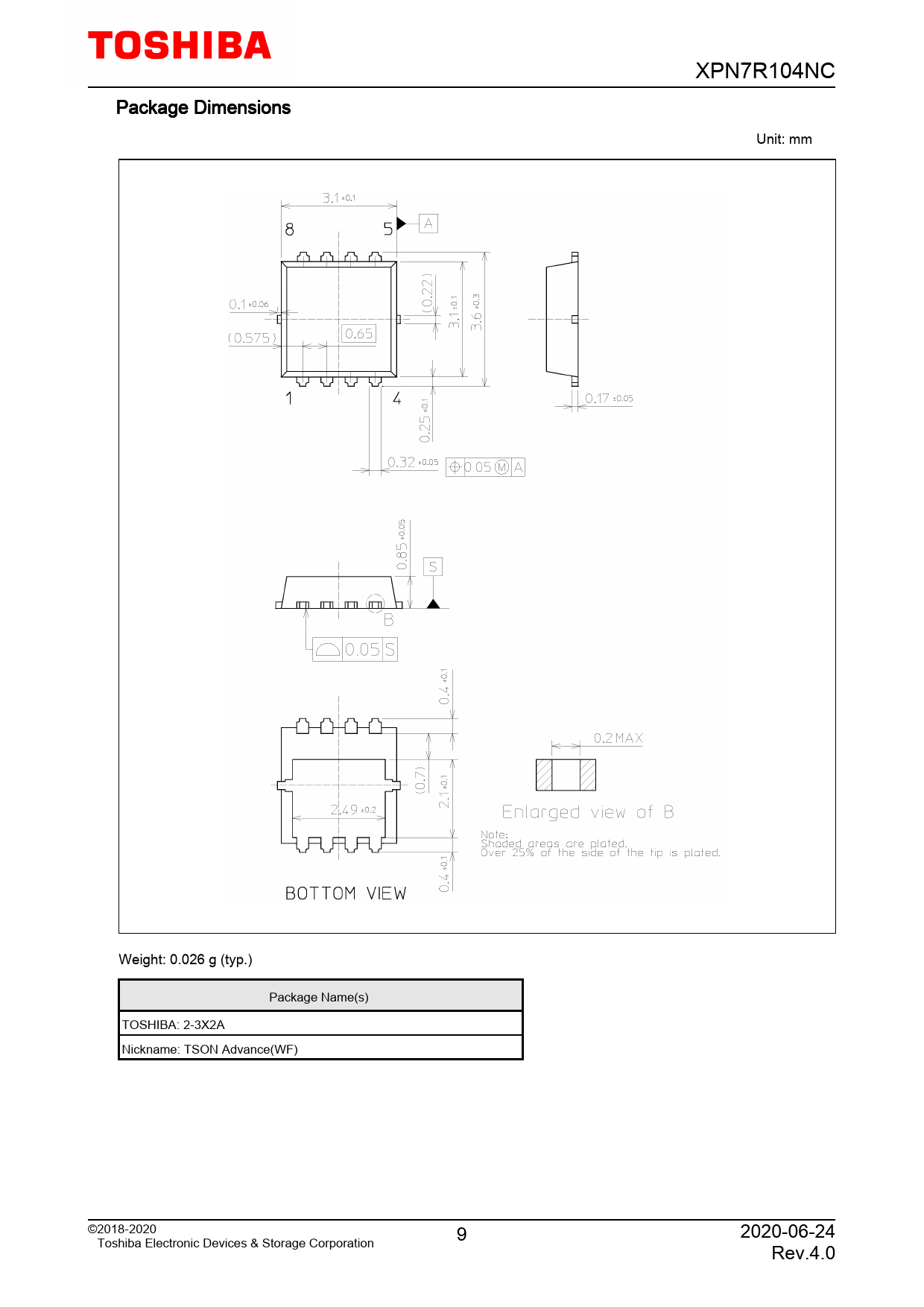 XPN7R104NC. Package. Dimensions. Unit:. mm. Weight:. 0.026. g. (typ.). Package. Name(s). TOSHIBA:. 2-3X2A. Nickname:. TSON. Advance(WF). ©2018-2020. 9