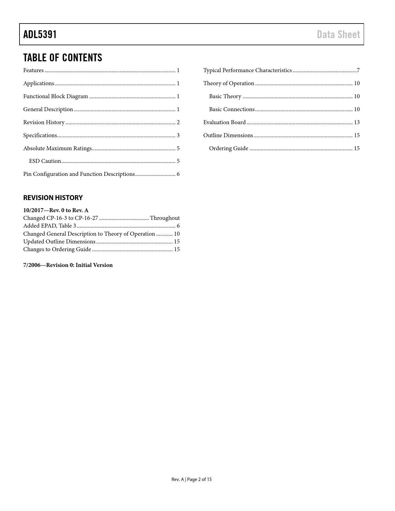 Páginas / Página15 / 2 — ADL5391. Data Sheet. TABLE OF CONTENTS. REVISION HISTORY. 10/2017—Rev. 0 …