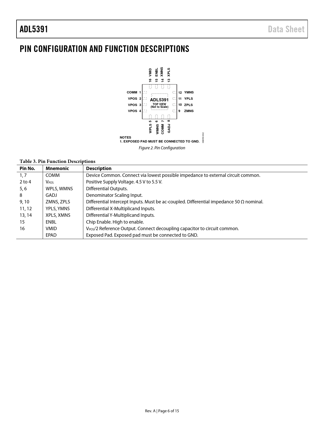 ADL5391Data SheetPIN CONFIGURATION AND FUNCTION DESCRIPTIONSSIDNSNBLVMEXMXPL16151413COMM 112 YMNSVPOS 211 YPLSADL5391VPOS 3TOP VIEW10 ZPLS(Not to Scale)VPOS 49ZMNS5678SLSMNMADJWPWMCOGNOTES -002 059 1. EXPOSED PAD MUST BE CONNECTED TO GND. 06 Figure 2. Pin Configuration Table 3. Pin Function Descriptions Pin No.MnemonicDescription 1, 7 COMM Device Common. Connect via lowest possible impedance to external circuit common. 2 to 4 VPOS Positive Supply Voltage. 4.5 V to 5.5 V. 5, 6 WPLS, WMNS Differential Outputs. 8 GADJ Denominator Scaling Input. 9, 10 ZMNS, ZPLS Differential Intercept Inputs. Must be ac-coupled. Differential impedance 50 Ω nominal. 11, 12 YPLS, YMNS Differential X-Multiplicand Inputs. 13, 14 XPLS, XMNS Differential Y-Multiplicand Inputs. 15 ENBL Chip Enable. High to enable. 16 VMID VPOS/2 Reference Output. Connect decoupling capacitor to circuit common. EPAD Exposed Pad. Exposed pad must be connected to GND. Rev. A | Page 6 of 15 Document Outline Features Applications Functional Block Diagram General Description Table of Contents Revision History Specifications Absolute Maximum Ratings ESD Caution Pin Configuration and Function Descriptions Typical Performance Characteristics Theory of Operation Basic Theory Calibration Basic Connections Multiplier Connections Matching the Input/Output Wideband Voltage-Controlled Amplifier/Amplitude Modulator Squaring and Frequency Doubling Use as a Detector Evaluation Board Outline Dimensions Ordering Guide