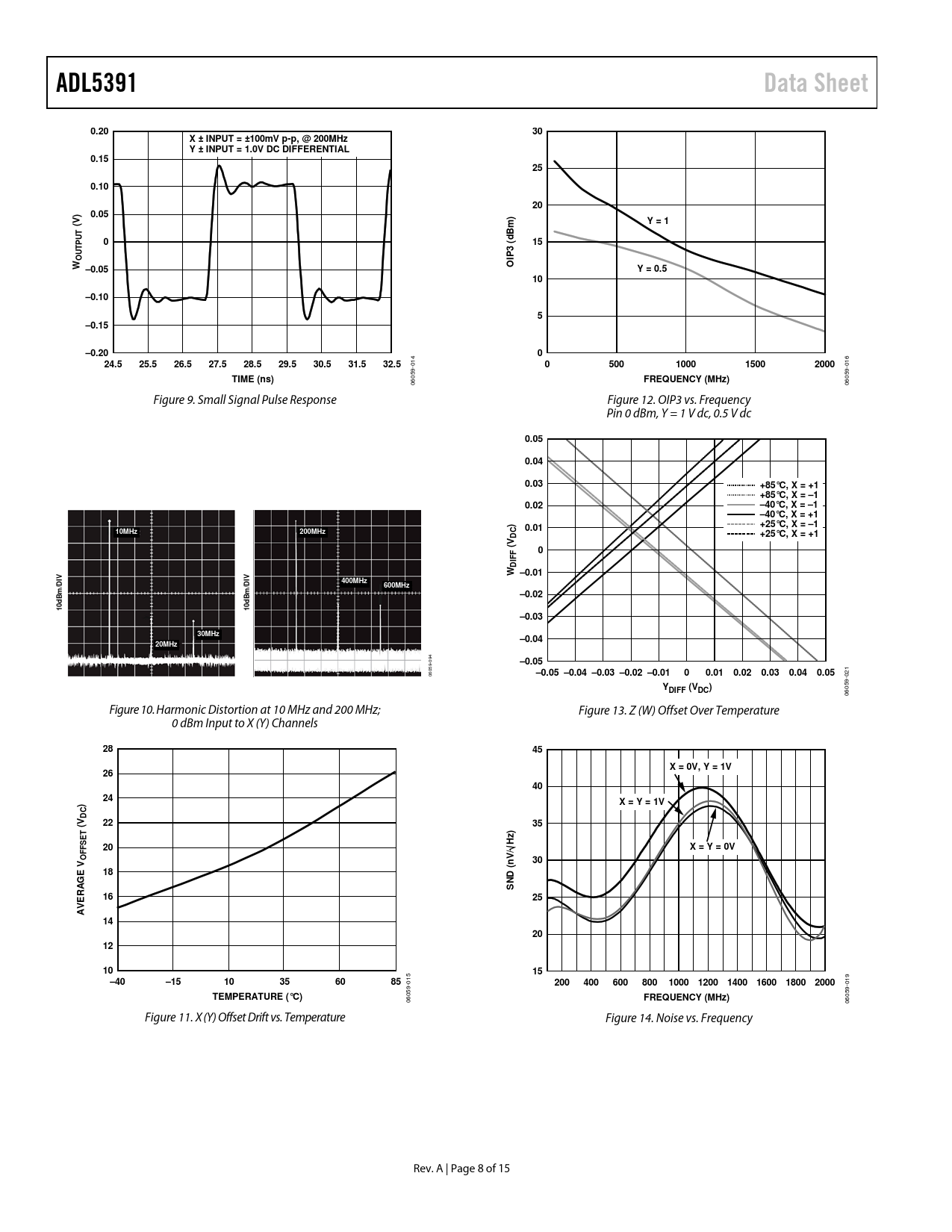 ADL5391Data Sheet0.2030X ± INPUT = ±100mV p-p, @ 200MHz Y ± INPUT = 1.0V DC DIFFERENTIAL0.15250.10200.05Y = 1(V)Bm)UTdP0153 (UT OIPWO–0.05Y = 0.510–0.105–0.15–0.20024.525.526.527.528.529.530.531.532.5 014 0500100015002000 016 TIME (ns)FREQUENCY (MHz) 06059- 06059- Figure 9. Small Signal Pulse Response Figure 12. OIP3 vs. Frequency Pin 0 dBm, Y = 1 V dc, 0.5 V dc 0.050.040.03+85°C, X = +1+85°C, X = –10.02–40°C, X = –1 –40°C, X = +1)+25°C, X = –110MHz0.01200MHzDC+25°C, X = +1(V F0F DIW –0.01VV400MHzDIDI600MHzBm/Bm/–0.0210d10d–0.0330MHz–0.0420MHz 094 –0.05–0.05 –0.04 –0.03 –0.02 –0.0100.010.020.030.040.05 06059- 021 YDIFF (VDC) 06059- Figure 10. Harmonic Distortion at 10 MHz and 200 MHz; Figure 13. Z (W) Offset Over Temperature 0 dBm Input to X (Y) Channels 2845X = 0V, Y = 1V264024)X = Y = 1VDC22(V35z)SET F20HX = Y = 0VF OV/30V(nE18D SNRAG16E25AV1420121015–40–1510356085 015 200400600800100012001400160018002000 019 TEMPERATURE (°C)FREQUENCY (MHz) 06059- 06059- Figure 11. X (Y) Offset Drift vs. Temperature Figure 14. Noise vs. Frequency Rev. A | Page 8 of 15 Document Outline Features Applications Functional Block Diagram General Description Table of Contents Revision History Specifications Absolute Maximum Ratings ESD Caution Pin Configuration and Function Descriptions Typical Performance Characteristics Theory of Operation Basic Theory Calibration Basic Connections Multiplier Connections Matching the Input/Output Wideband Voltage-Controlled Amplifier/Amplitude Modulator Squaring and Frequency Doubling Use as a Detector Evaluation Board Outline Dimensions Ordering Guide