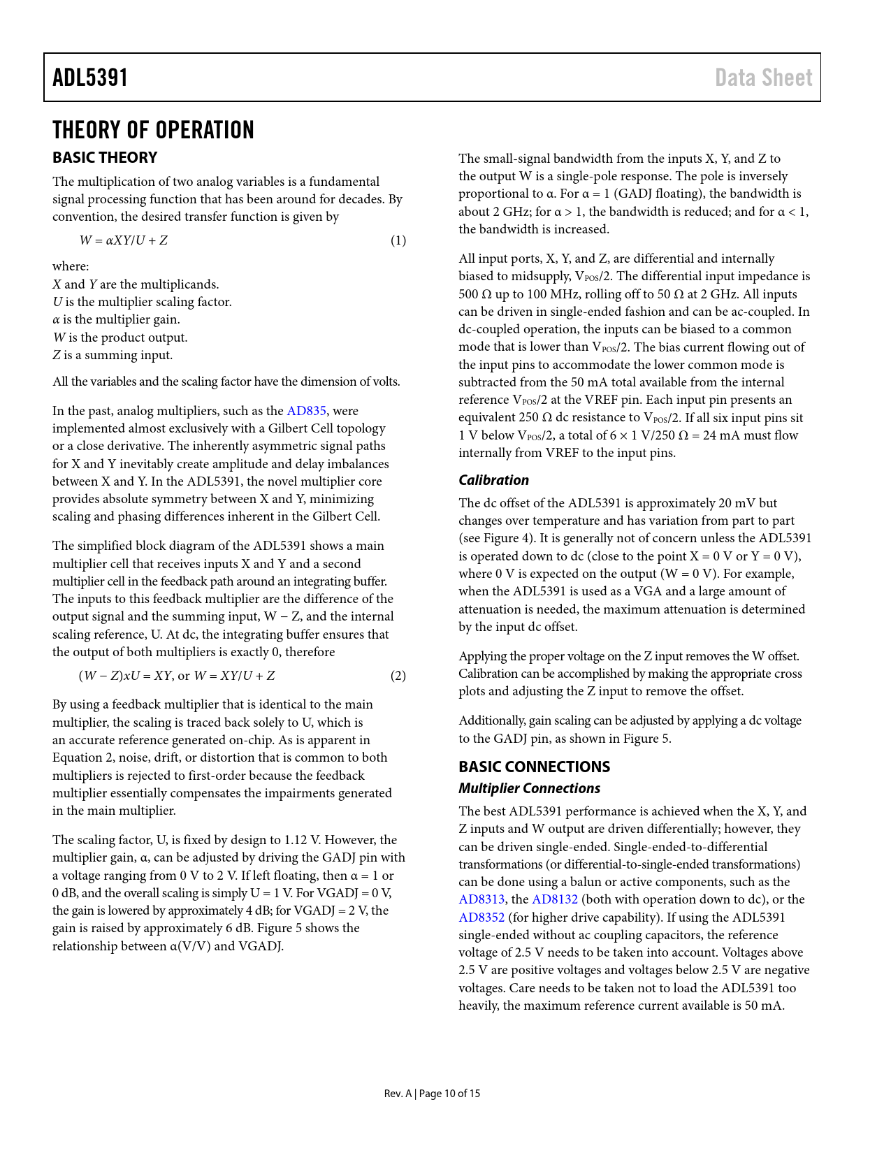 ADL5391 Data Sheet THEORY OF OPERATION BASIC THEORY Calibration BASIC CONNECTIONS Multiplier Connections