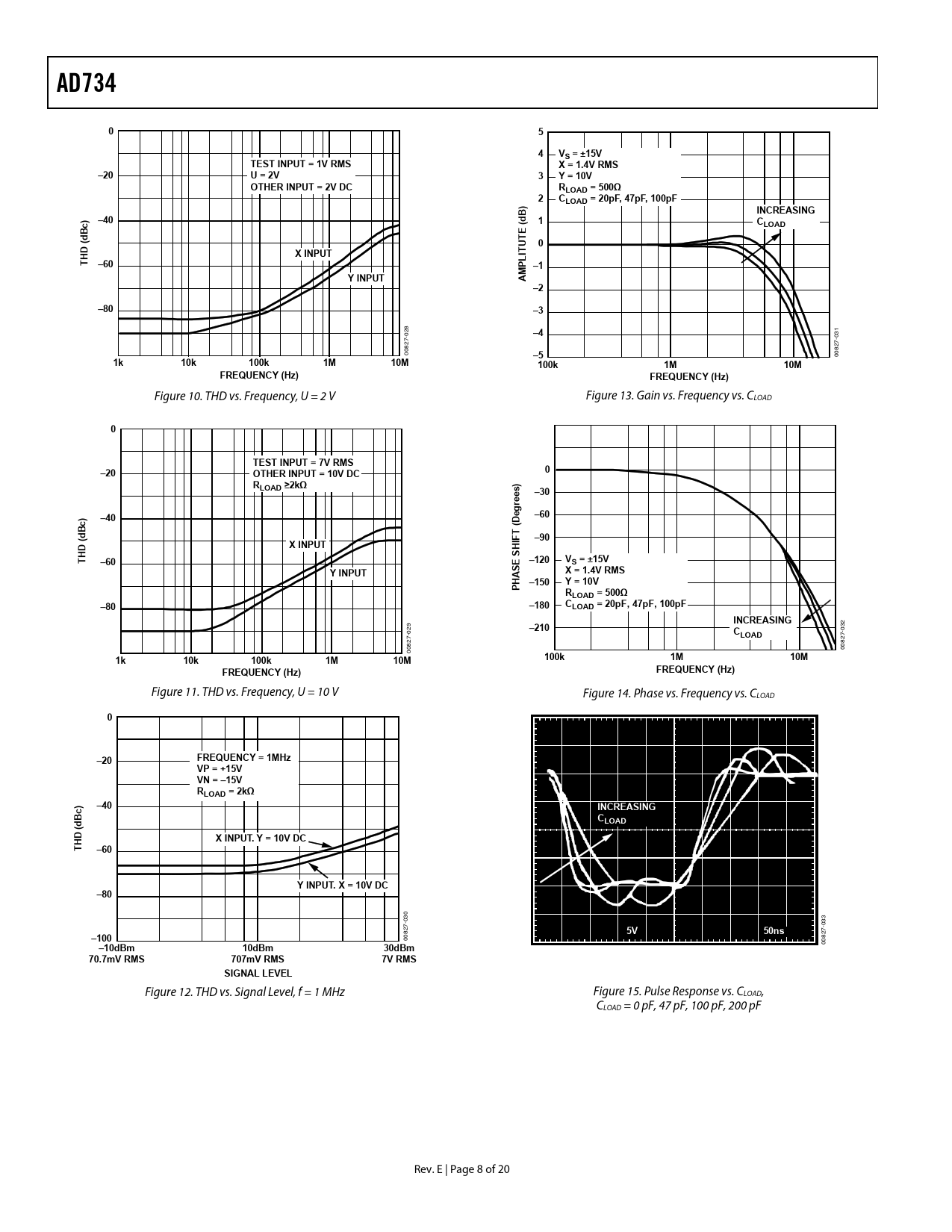 AD734. VS = ±15V. TEST INPUT = 1V RMS. X = 1.4V RMS. –20. U = 2V. Y = 10V. OTHER INPUT = 2V DC. RLOAD = 500Ω. CLOAD = 20pF, 47pF, 100pF