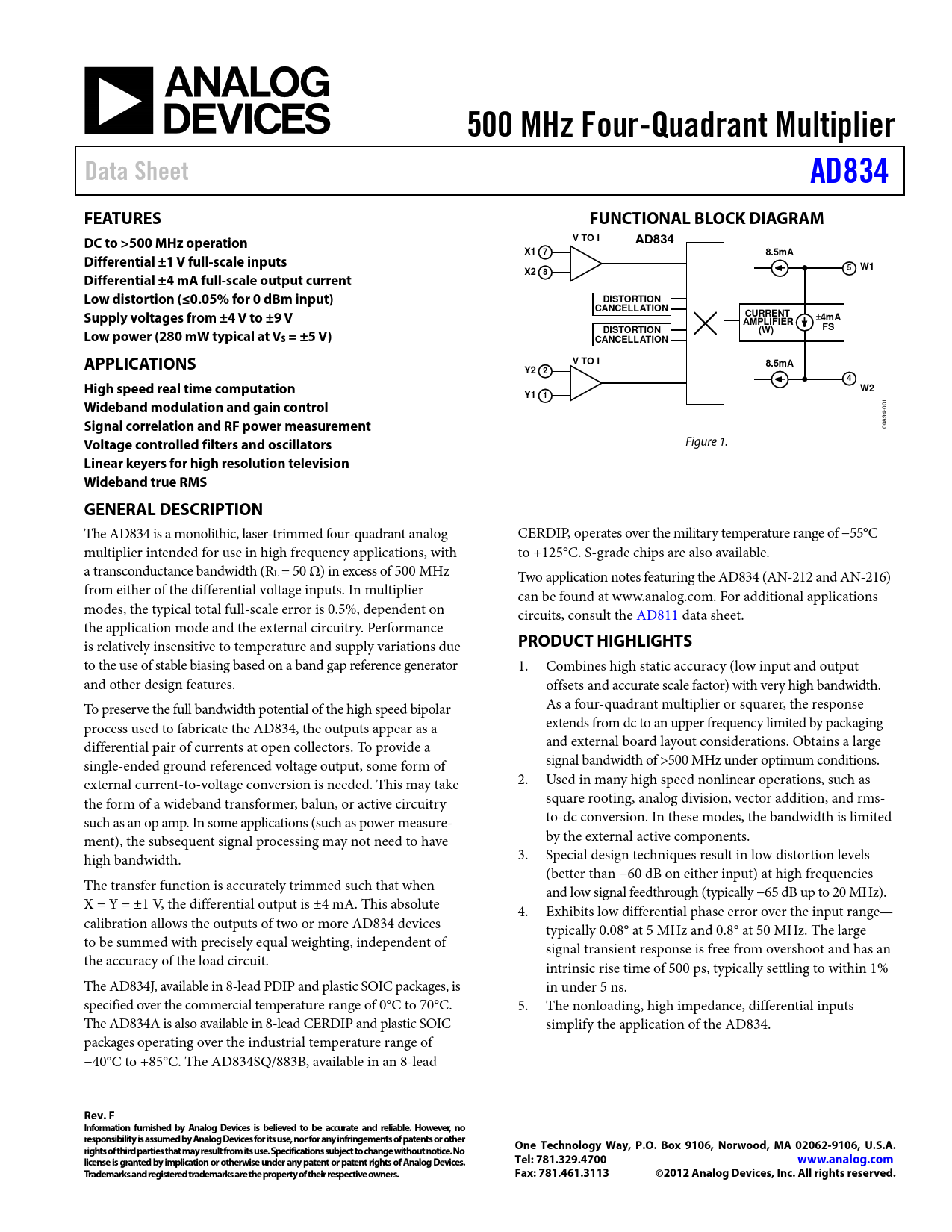 500 MHz Four-Quadrant Multiplier. Data Sheet. AD834. FEATURES. FUNCTIONAL BLOCK DIAGRAM. DC to >500 MHz operation. V TO I. X1 7