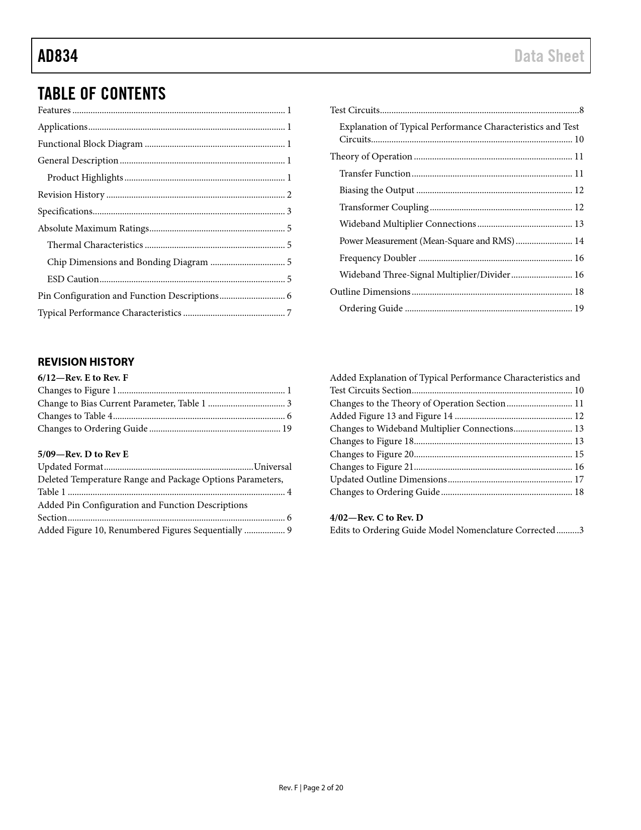 Páginas / Página20 / 2 — AD834. Data Sheet. TABLE OF CONTENTS. REVISION HISTORY 6/12—Rev. E to …