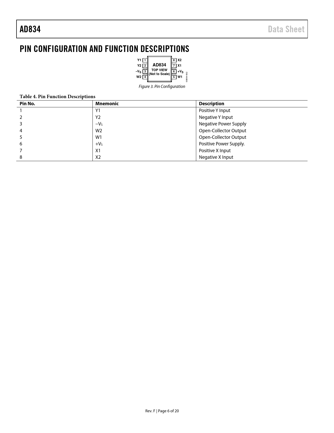 Páginas / Página20 / 6 — AD834. Data Sheet. PIN CONFIGURATION AND FUNCTION DESCRIPTIONS. TOP VIEW. …