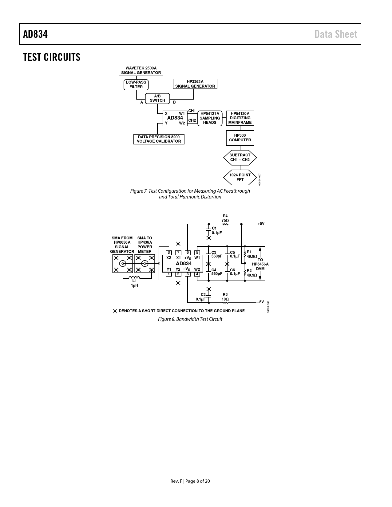 AD834. Data Sheet. TEST CIRCUITS. WAVETEK 2500A. SIGNAL GENERATOR. LOW-PASS. HP3362A. FILTER. A/B. SWITCH. CH1. HP54121A. HP54120A. SAMPLING