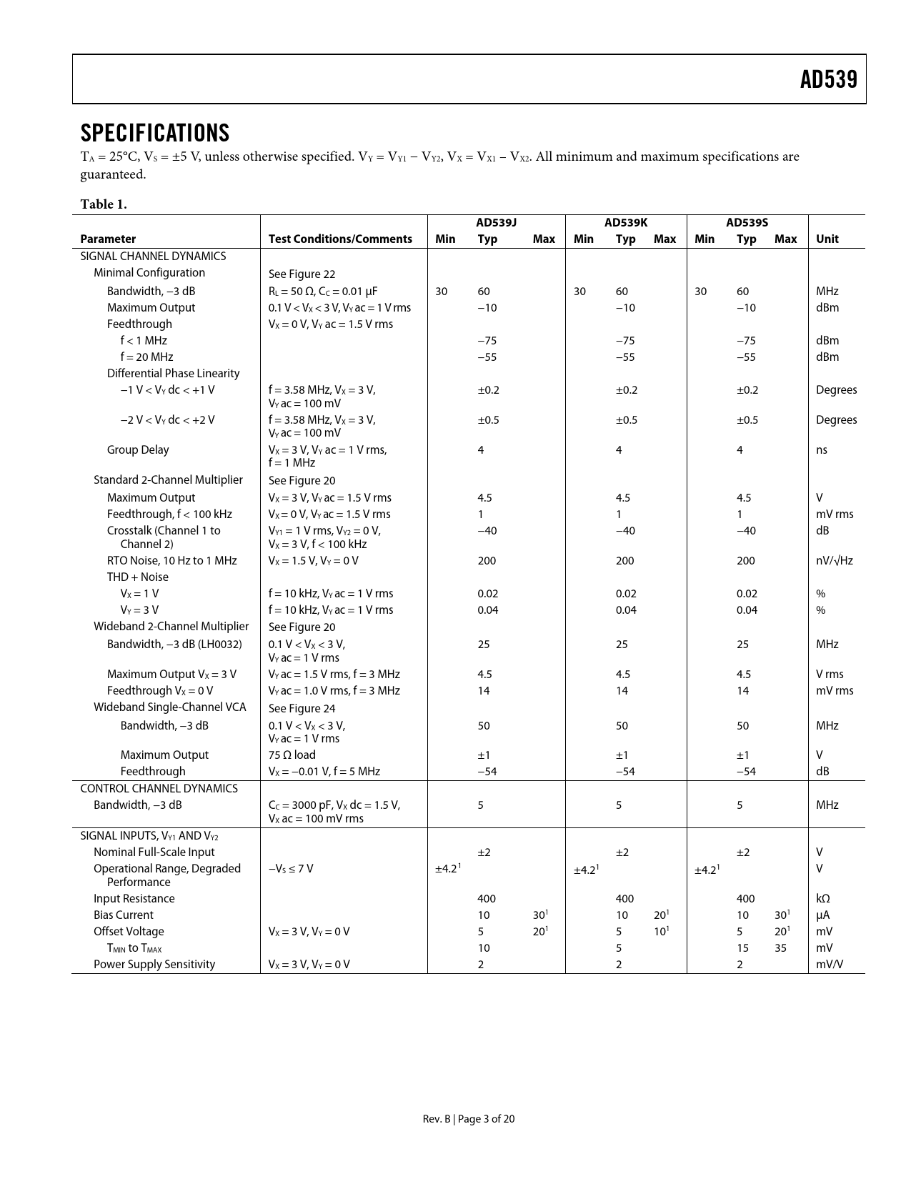 AD539. SPECIFICATIONS. Table 1. AD539J. AD539K. AD539S. Parameter Test. Conditions/Comments. Min. Typ. Max Min Typ Max Min Typ Max Unit