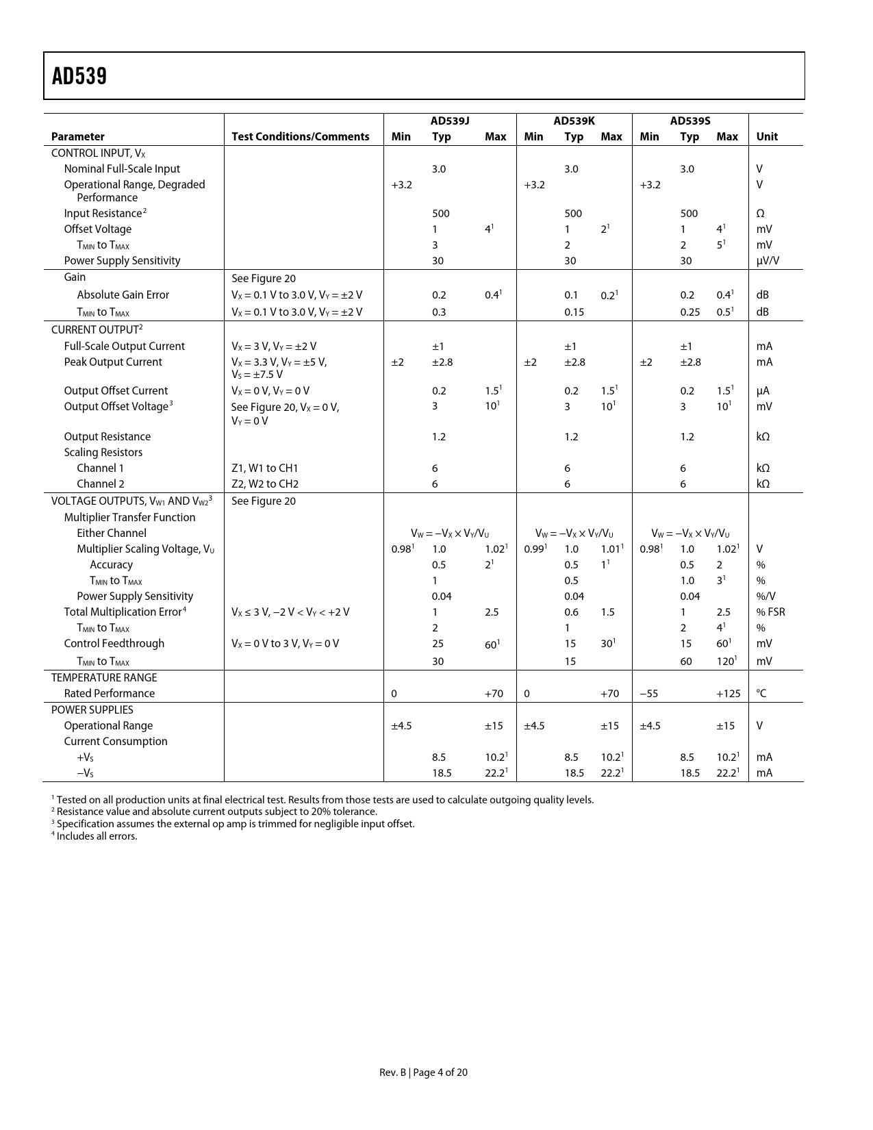 Páginas / Página20 / 4 — AD539. AD539J. AD539K. AD539S. Parameter Test. Conditions/Comments. Min. …