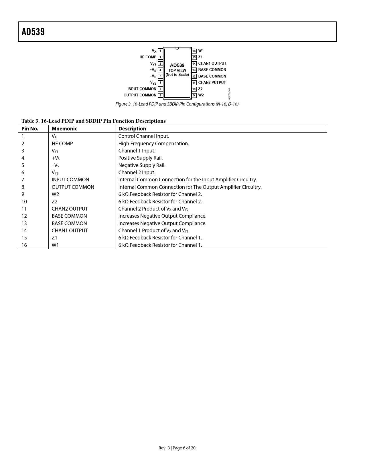 AD539. VX 1. 16 W1. HF COMP 2. 15 Z1. VY1 3. 14 CHAN1 OUTPUT. +VS 4. TOP VIEW. 13 BASE COMMON. (Not to Scale). S 5. 12 BASE COMMON. VY2 6