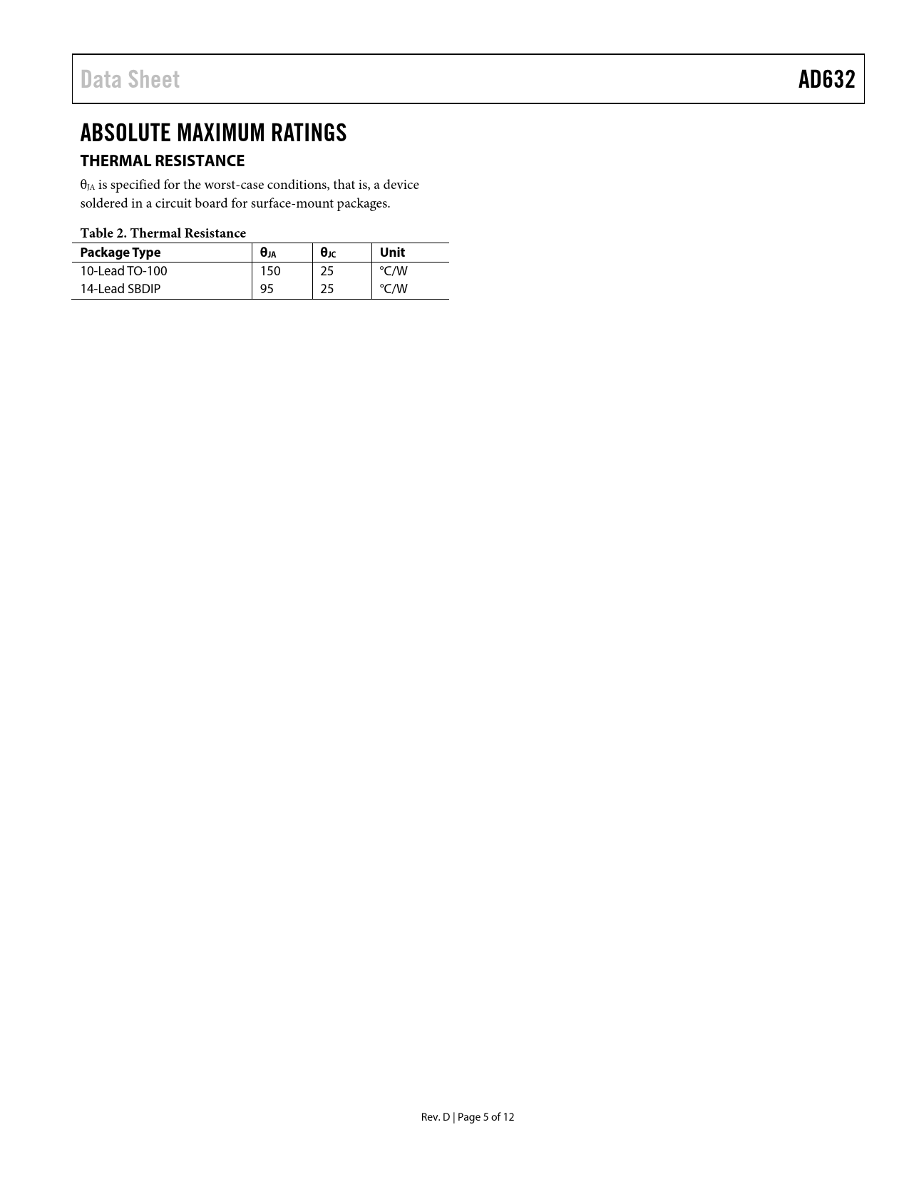 Páginas / Página12 / 5 — Data Sheet. AD632. ABSOLUTE MAXIMUM RATINGS THERMAL RESISTANCE. Table 2. …