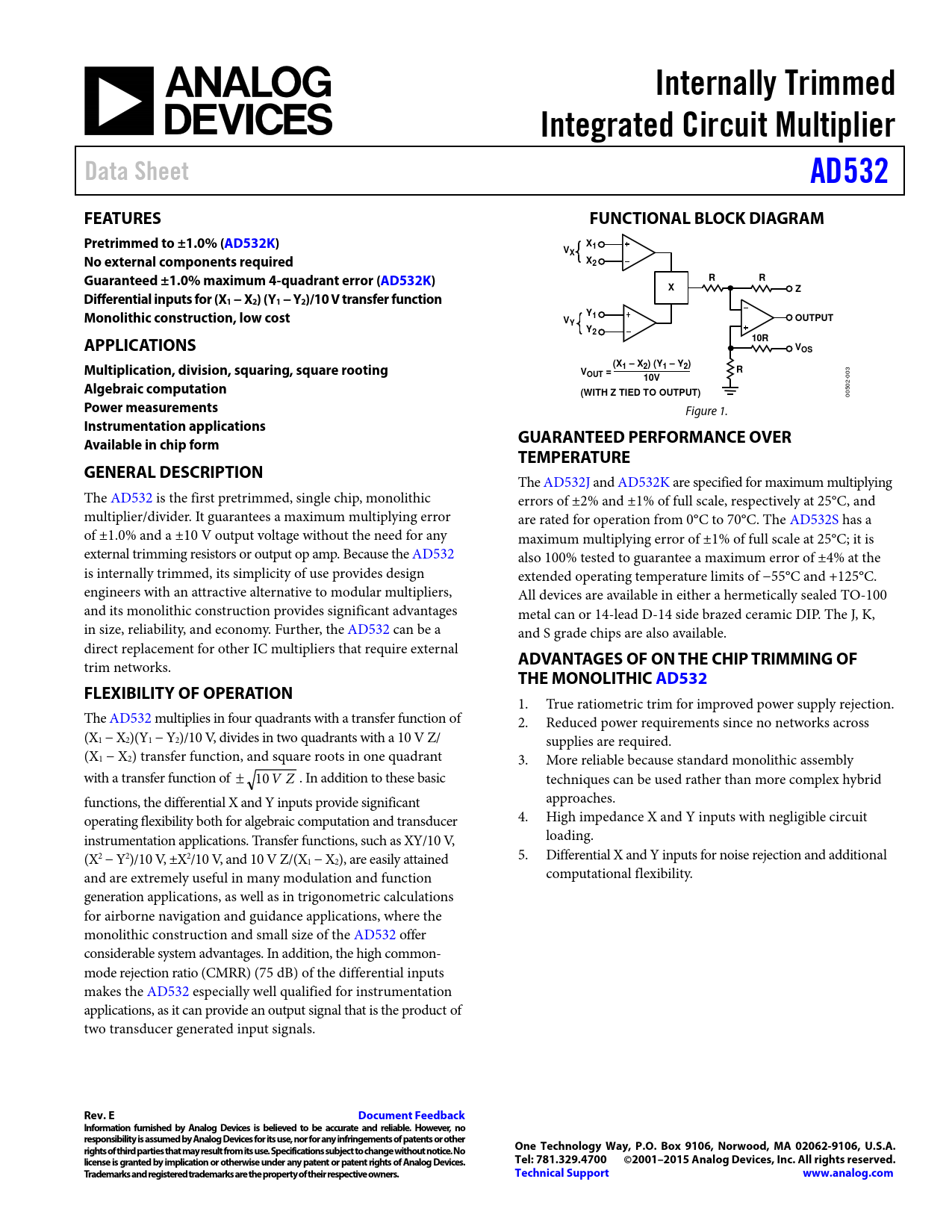 Internally Trimmed. Integrated Circuit Multiplier. Data Sheet. AD532. FEATURES. FUNCTIONAL BLOCK DIAGRAM