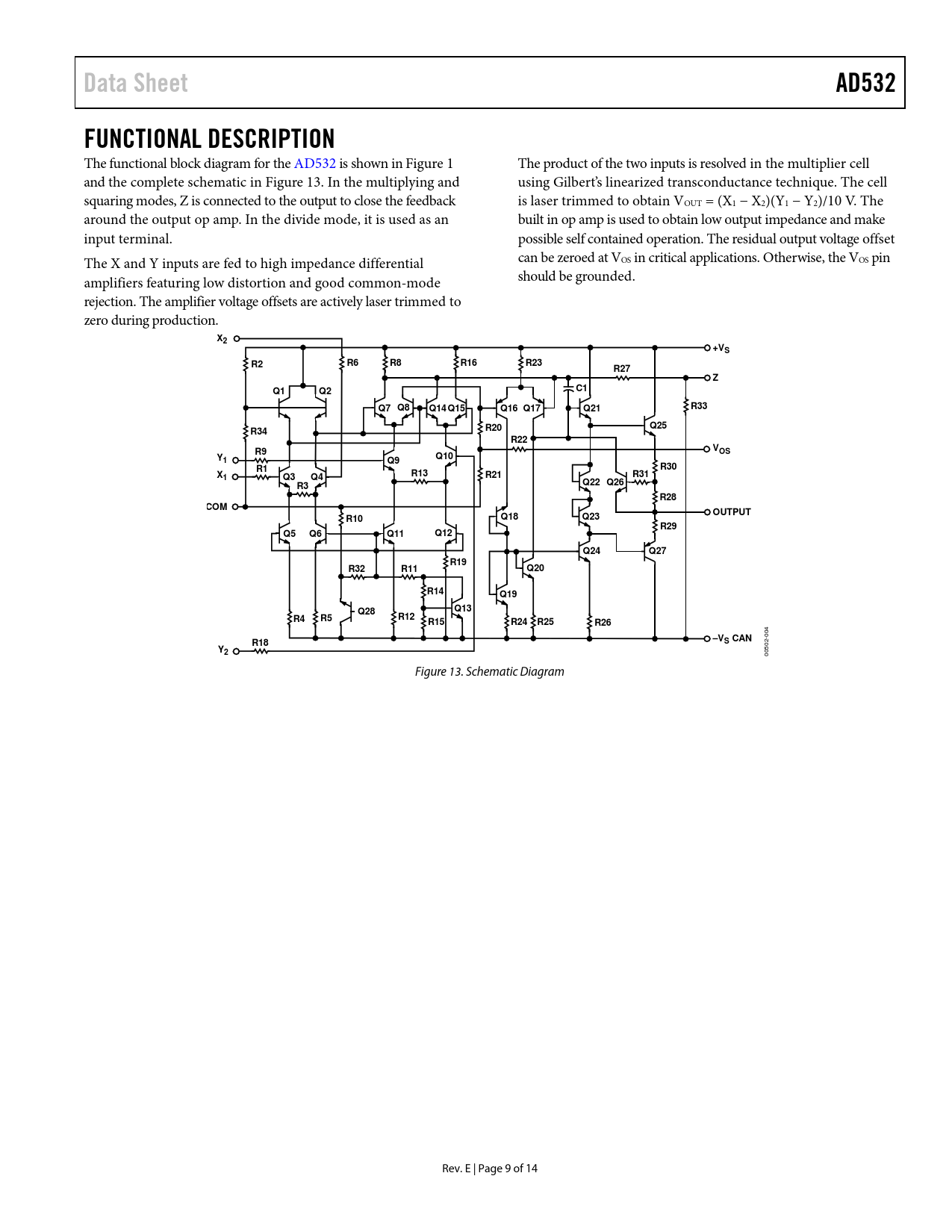 link to page 1 link to page 9 Data SheetAD532FUNCTIONAL DESCRIPTION The functional block diagram for the AD532 is shown in Figure 1 The product of the two inputs is resolved in the multiplier cel and the complete schematic in Figure 13. In the multiplying and using Gilbert’s linearized transconductance technique. The cell squaring modes, Z is connected to the output to close the feedback is laser trimmed to obtain VOUT = (X1 − X2)(Y1 − Y2)/10 V. The around the output op amp. In the divide mode, it is used as an built in op amp is used to obtain low output impedance and make input terminal. possible self contained operation. The residual output voltage offset The X and Y inputs are fed to high impedance differential can be zeroed at VOS in critical applications. Otherwise, the VOS pin amplifiers featuring low distortion and good common-mode should be grounded. rejection. The amplifier voltage offsets are actively laser trimmed to zero during production. X2+VSR2R6R8R16R23R27ZQ1Q2C1Q7 Q8Q14 Q15Q16 Q17Q21R33Q25R34R20R22R9VOSY1Q9Q10R1R30XR131Q3Q4R21R31R3Q22 Q26R28COMOUTPUTR10Q18Q23R29Q5Q6Q11Q12Q24Q27R19R32R11Q20R14Q19Q28Q13R4R5R12R15R24R25R26–V 004 R18S CANY2 00502- Figure 13. Schematic Diagram Rev. E | Page 9 of 14 Document Outline Features Applications General Description Flexibility of Operation Functional Block Diagram Guaranteed Performance Over Temperature Advantages of On The Chip Trimming of The Monolithic AD532 Revision History Specifications Thermal Resistance Chip Dimensions And Bonding Diagram ESD Caution Pin Configuration and Function Descriptions Typical Performance Characteristics Functional Description AD532 Performance Characteristics Nonlinearity AC Feedthrough Common-Mode Rejection Dynamic Characteristics Power Supply Considerations Noise Characteristics Applications Replacing Other IC Multipliers Multiplication Squaring Division Square Root Additional Information Outline Dimensions Ordering Guide