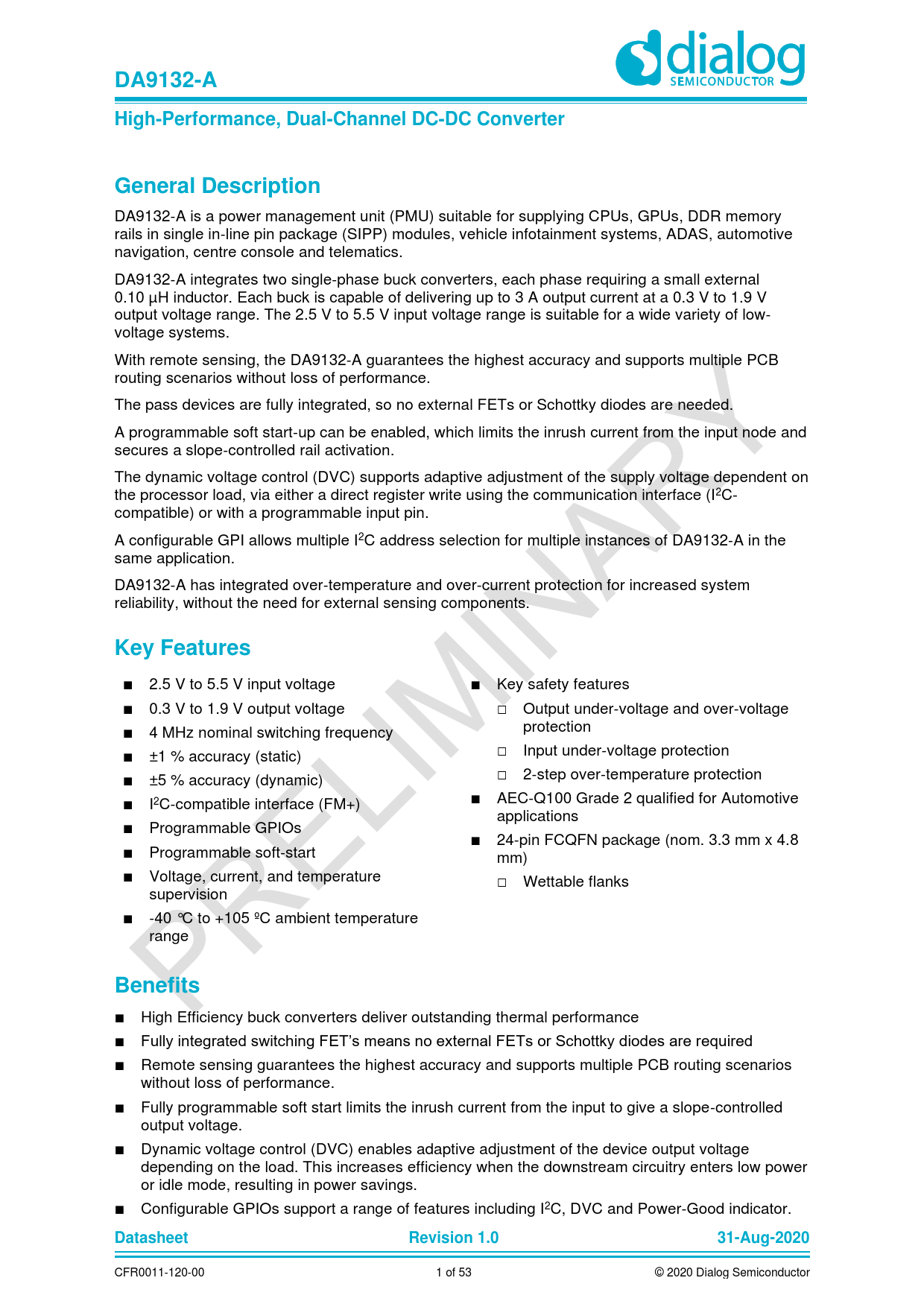 DA9132-A. High-Performance, Dual-Channel DC-DC Converter. General Description. Key Features. Benefits. Datasheet. Revision 1.0