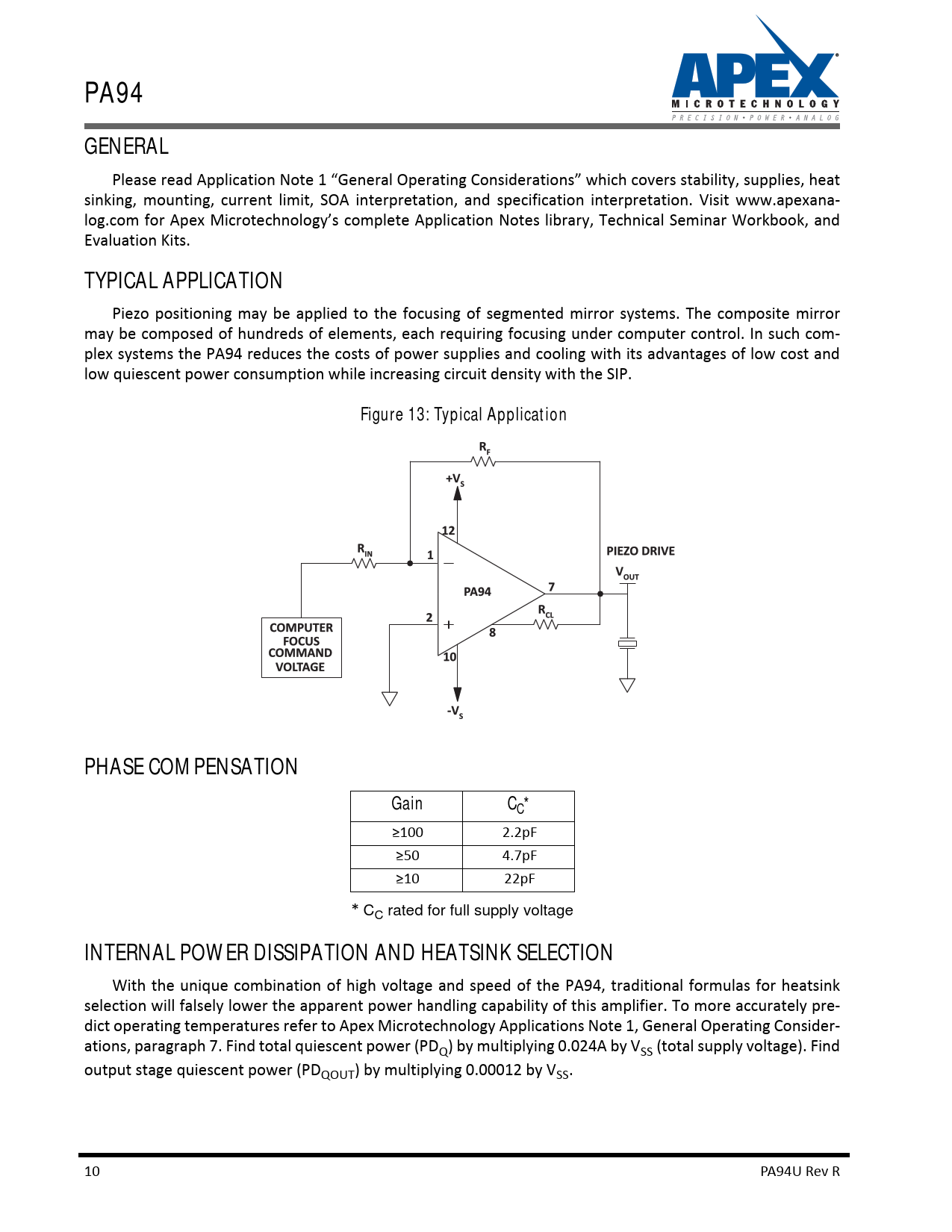PA94. GENERAL. TYPICAL APPLICATION. Figure 13: Typical Application. PHASE COMPENSATION. Gain. CC*