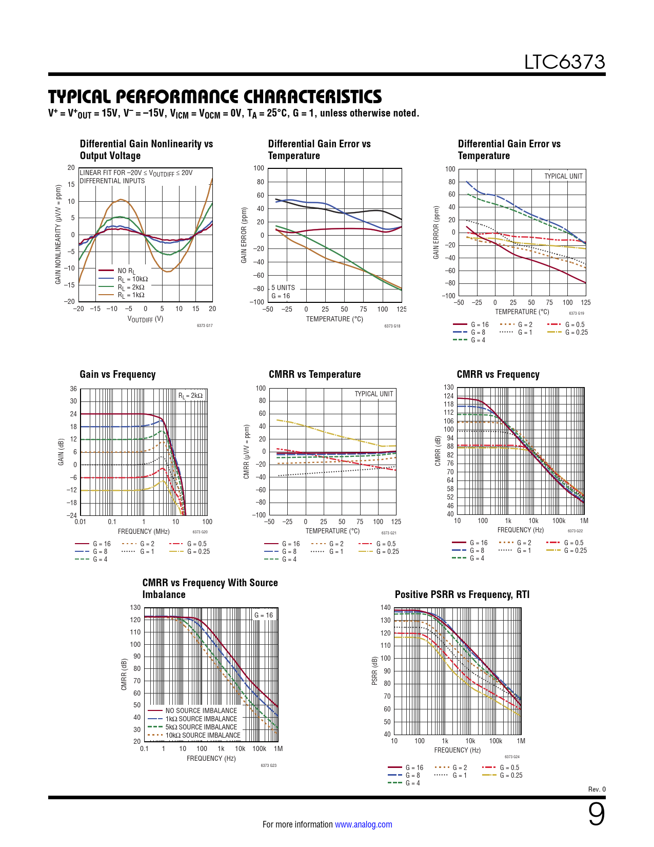 36 100 130 RL = 2kΩ TYPICAL UNIT 124 30 80 118 24 60 112 106 18 40 100 12 20 94 88 6 V/V = ppm) 0 82 GAIN (dB) 0 –20 CMRR (dB) 76 70 –6 CMRR (µ –40 64 –12 –60 58 52 –18 –80 46 –24 –100 40 0.01 0.1 1 10 100 –50 –25 0 25 50 75 100 125 10 100 1k 10k 100k 1M FREQUENCY (MHz) 6373 G20 TEMPERATURE (°C) FREQUENCY (Hz) 6373 G21 6373 G22 G = 16 G = 2 G = 0.5 G = 16 G = 2 G = 0.5 G = 16 G = 2 G = 0.5 G = 8 G = 1 G = 0.25 G = 8 G = 1 G = 0.25 G = 8 G = 1 G = 0.25 G = 4 G = 4 G = 4
