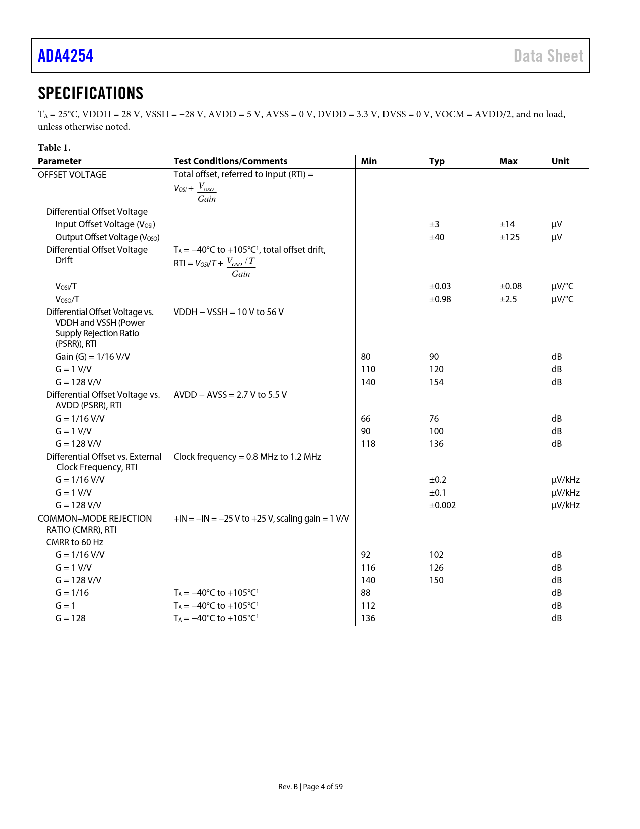 ADA4254. Data Sheet. SPECIFICATIONS. Table 1. Parameter Test. Conditions/Comments. Min. Typ. Max. Unit