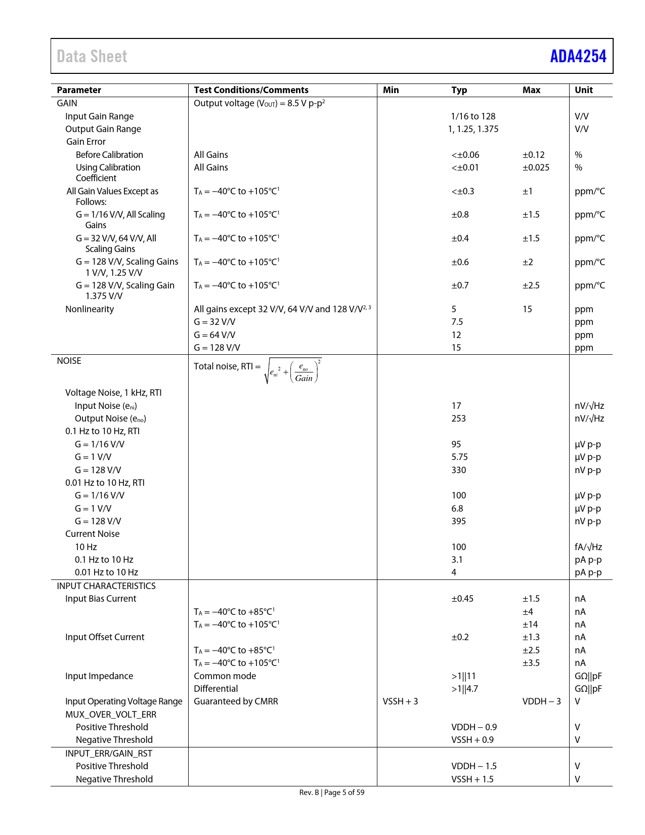 link to page 7 link to page 7 link to page 7 link to page 7 link to page 7 Data SheetADA4254Parameter TestConditions/CommentsMinTypMaxUnit GAIN Output voltage (VOUT) = 8.5 V p-p2 Input Gain Range 1/16 to 128 V/V Output Gain Range 1, 1.25, 1.375 V/V Gain Error Before Calibration All Gains <±0.06 ±0.12 % Using Calibration All Gains <±0.01 ±0.025 % Coefficient All Gain Values Except as TA = −40°C to +105°C1 <±0.3 ±1 ppm/°C Follows: G = 1/16 V/V, All Scaling TA = −40°C to +105°C1 ±0.8 ±1.5 ppm/°C Gains G = 32 V/V, 64 V/V, All TA = −40°C to +105°C1 ±0.4 ±1.5 ppm/°C Scaling Gains G = 128 V/V, Scaling Gains TA = −40°C to +105°C1 ±0.6 ±2 ppm/°C 1 V/V, 1.25 V/V G = 128 V/V, Scaling Gain TA = −40°C to +105°C1 ±0.7 ±2.5 ppm/°C 1.375 V/V Nonlinearity All gains except 32 V/V, 64 V/V and 128 V/V2, 3 5 15 ppm G = 32 V/V 7.5 ppm G = 64 V/V 12 ppm G = 128 V/V 15 ppm NOISE 2 Total noise, RTI = 2 e no e ni Gain Voltage Noise, 1 kHz, RTI Input Noise (eni) 17 nV/√Hz Output Noise (eno) 253 nV/√Hz 0.1 Hz to 10 Hz, RTI G = 1/16 V/V 95 μV p-p G = 1 V/V 5.75 μV p-p G = 128 V/V 330 nV p-p 0.01 Hz to 10 Hz, RTI G = 1/16 V/V 100 μV p-p G = 1 V/V 6.8 μV p-p G = 128 V/V 395 nV p-p Current Noise 10 Hz 100 fA/√Hz 0.1 Hz to 10 Hz 3.1 pA p-p 0.01 Hz to 10 Hz 4 pA p-p INPUT CHARACTERISTICS Input Bias Current ±0.45 ±1.5 nA TA = −40°C to +85°C1 ±4 nA TA = −40°C to +105°C1 ±14 nA Input Offset Current ±0.2 ±1.3 nA TA = −40°C to +85°C1 ±2.5 nA TA = −40°C to +105°C1 ±3.5 nA Input Impedance Common mode >1||11 GΩ||pF Differential >1||4.7 GΩ||pF Input Operating Voltage Range Guaranteed by CMRR VSSH + 3 VDDH − 3 V MUX_OVER_VOLT_ERR Positive Threshold VDDH − 0.9 V Negative Threshold VSSH + 0.9 V INPUT_ERR/GAIN_RST Positive Threshold VDDH − 1.5 V Negative Threshold VSSH + 1.5 V Rev. B | Page 5 of 59 Document Outline FEATURES APPLICATIONS GENERAL DESCRIPTION SIMPLIFIED FUNCTIONAL BLOCK DIAGRAM COMPANION PRODUCTS TABLE OF CONTENTS REVISION HISTORY SPECIFICATIONS TIMING SPECIFICATIONS Timing Diagrams ABSOLUTE MAXIMUM RATINGS THERMAL RESISTANCE ESD CAUTION PIN CONFIGURATIONS AND FUNCTION DESCRIPTIONS TYPICAL PERFORMANCE CHARACTERISTICS THEORY OF OPERATION PROGRAMMABLE GAIN INSTRUMENTATION AMPLIFIER INPUT MULTIPLEXER EMI REDUCTION AND INTERNAL EMI FILTER INPUT AMPLIFIER OUTPUT AMPLIFIER POWER SUPPLIES ESD MAP OUTPUT RIPPLE CALIBRATION CONFIGURATION GENERAL-PURPOSE INPUTS/OUTPUTS (GPIOs) EXCITATION CURRENTS EXTERNAL CLOCK SYNCHRONIZATION SEQUENTIAL CHIP SELECT (SCS) GAIN ERROR CALIBRATION WIRE BREAK DETECTION TEST MULTIPLEXER EXTERNAL MUX CONTROL DIGITAL INTERFACE SPI INTERFACE ACCESSING THE ADA4254 REGISTER MAP CHECKSUM PROTECTION CRC CALCULATION MEMORY MAP CHECKSUM PROTECTION READ-ONLY MEMORY (ROM) CHECKSUM PROTECTION SPI READ/WRITE ERROR DETECTION SPI COMMAND LENGTH ERROR DETECTION APPLICATIONS INFORMATION INPUT AND OUTPUT OFFSET VOLTAGE AND NOISE ADC CLOCK SYNCHRONIZATION PROGRAMMABLE LOGIC CONTROLLER (PLC)VOLTAGE/CURRENT INPUT 3-WIRE RTD WITH CURRENT EXCITATION HIGH RAIL CURRENT SENSING REGISTER SUMMARY REGISTER DETAILS GAIN_MUX REGISTER DETAILS Bit 7, G4—Output Amplifier Scaling Gain (1.375 V/V) Bits[6:3], G[3:0]—Input Amplifier Gain Setting Bits[1:0], EXT_MUX[1:0]—External Multiplexer Control SOFTWARE RESET REGISTER (RESET) DETAILS Bit 0, RST—Soft Reset CLOCK SYNCHRONIZATION CONFIGURATION REGISTER (SYNC_CFG) DETAILS Bit 6, CLK_OUT_SEL—Clock Output Select Bit 4, SYNC_POL—Clock Synchronization Polarity Bits[2:0], SYNC[2:0]—Internal Clock Divider Value DIGITAL ERROR REGISTER (DIGITAL_ERR) DETAILS Bit 6, CAL_BUSY—Calibration Busy (Read Only) Bit 5, SPI_CRC_ERR—SPI CRC Error Bit 4, SPI_RW_ERR—SPI Read/Write Error Bit 3, SPI_SCLK_CNT_ERR—SPI SCLK Count Error Bit 1, MM_CRC_ERR—Memory Map CRC Error Bit 0, ROM_CRC_ERR—ROM CRC Error ANALOG ERROR REGISTER (ANALOG_ERR) DETAILS Bit 7, G_RST—Gain Reset Flag Bit 6, POR_HV—Power-On Reset HV Supply Bit 4, WB_ERR—Wire Break Detect Error Bit 3, FAULT_INT—Fault Interrupt Bit 2, OUTPUT_ERR—Output Amplifier Error Bit 1, INPUT_ERR—Input Amplifier Error Bit 0, MUX_OVER_VOLT_ERR—Input Multiplexer Overvoltage Error GPIO DATA REGISTER (GPIO_DATA) DETAILS Bits[6:0], GPIO_DATA[6:0]—GPIO Data Values INTERNAL MUX CONTROL REGISTER (INPUT_MUX) DETAILS Bit 6, SW_A1, and Bit 5, SW_A2—Channel 1 Input Switches Bit 4, SW_B1, and Bit 3, SW_B2—Channel 2 Input Switches Bit 2, SW_C1, and Bit 1, SW_C2—PGIA Input Test Multiplexer Switches Bit 0, SW_D12—PGIA Input Short Switch WIRE BREAK DETECT REGISTER (WB_DETECT) DETAILS Bit 7, WB_G_RST_DIS—Wire Break Gain Reset Disable Bit 3, SW_F1, and Bit 2, SW_F2—Fault Switch Selection Bits[1:0], WB_CURRENT—Detection Current Selection GPIO DIRECTION REGISTER (GPIO_DIR) DETAILS Bits[6:0], GPIO_DIR—GPIO Direction Configuration SEQUENTIAL CHIP SELECT REGISTER (SCS) DETAILS Bits[6:0], SCS—Sequential Chip Select Configuration ANALOG ERROR MASK REGISTER (ANALOG_ERR_DIS) DETAILS Bit 7, G_RST_DIS—Disable Gain Reset Error Flag Bit 6, POR_HV_DIS—Disable High Voltage Power Reset Flag Bit 4, WB_ERR_DIS—Disable Wire-Break Detection Flag Bit 3, MUX_PROT_DIS—Disable Input Multiplexer Protection Bit 2, OUTPUT_ERR_DIS—Disable Output Amplifier Error Flag Bit 1, INPUT_ERR_DIS—Disable Input Amplifier Error Flag Bit 0, MUX_OVER_VOLT_ERR_DIS—Disable Multiplexer Overvoltage Flag. DIGITAL ERROR MASK REGISTER (DIGITAL_ERR_DIS) DETAILS Bit 6, CAL_BUSY_DIS—Disable Calibration Busy Error Flag Bit 5, SPI_CRC_ERR_DIS—Disable SPI CRC Error Flag Bit 4, SPI_RW_ERR_DIS—Disable SPI Read/Write Error Flag Bit 3, SPI_SCLK_CNT_ERR_DIS—Disable SPI SCLK Count Error Flag Bit 2, M_CLK_CNT_ERR_DIS—Disable Master Clock Count Output Bit 1, MM_CRC_ERR_DIS—Disable Memory Map CRC Error Flag Bit 0, ROM_CRC_ERR_DIS—Disable ROM CRC Error Flag SPECIAL FUNCTION CONFIGURATION REGISTER (SF_CFG) DETAILS Bit 5, INT_CLK_OUT—Internal Oscillator Output Bit 4, EXT_CLK_IN—External