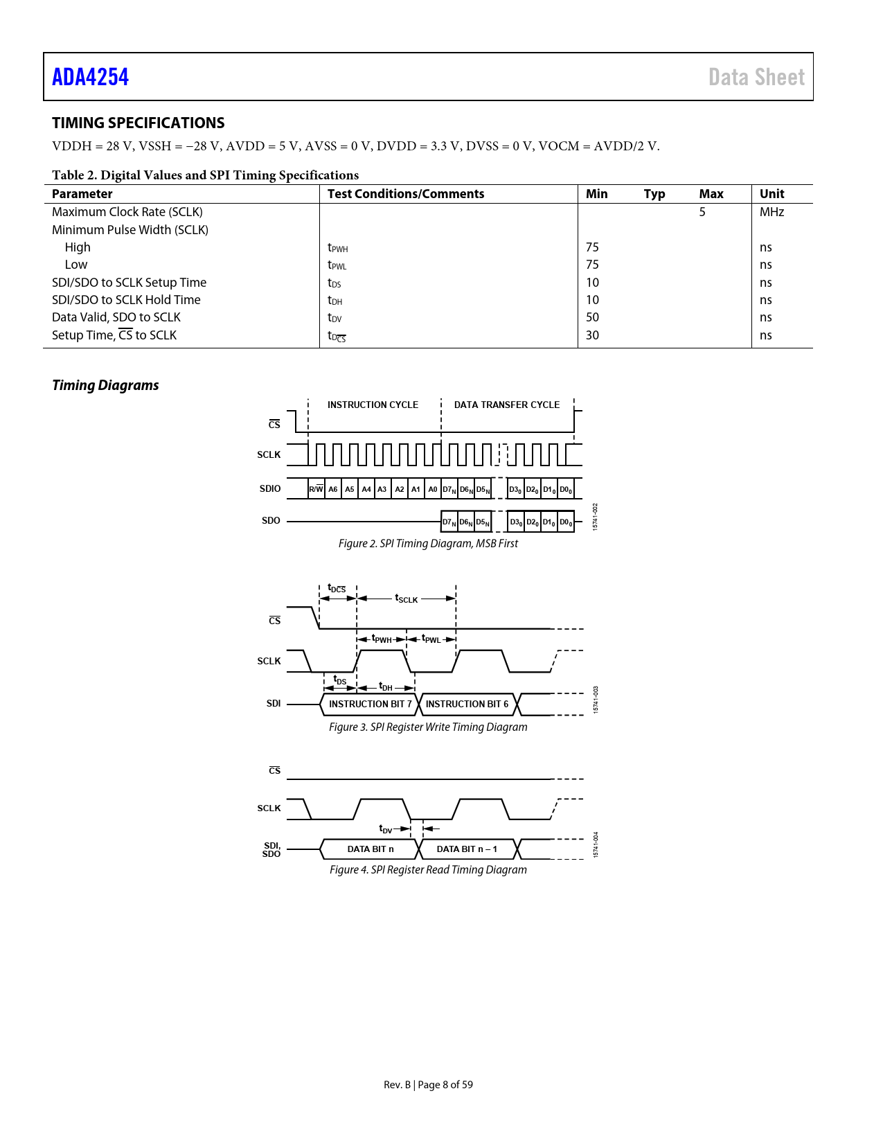 ADA4254. Data Sheet. TIMING SPECIFICATIONS. Table 2. Digital Values and SPI Timing Specifications Parameter Test