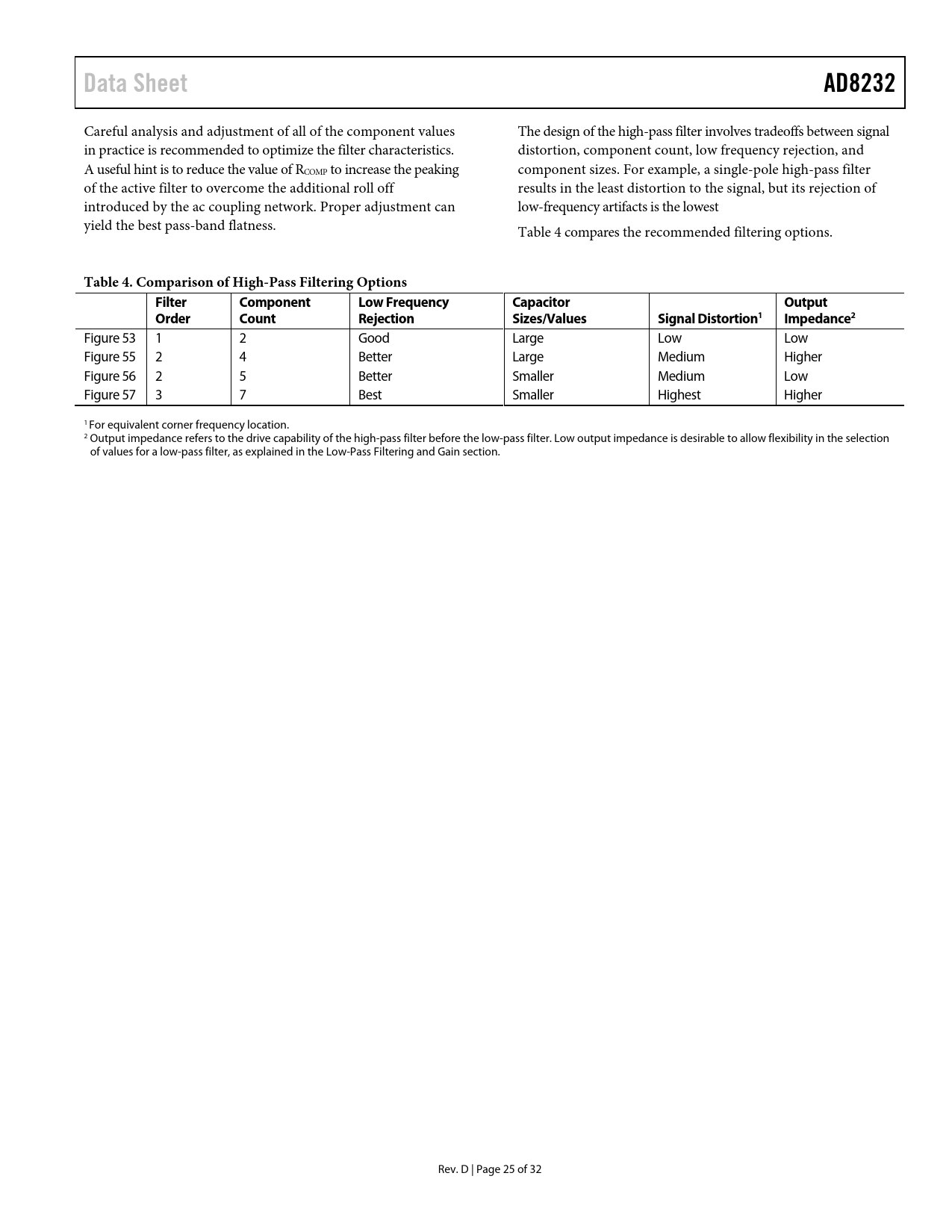 Páginas / Página32 / 25 — Data Sheet. AD8232. Table 4. Comparison of High-Pass Filtering Options. …