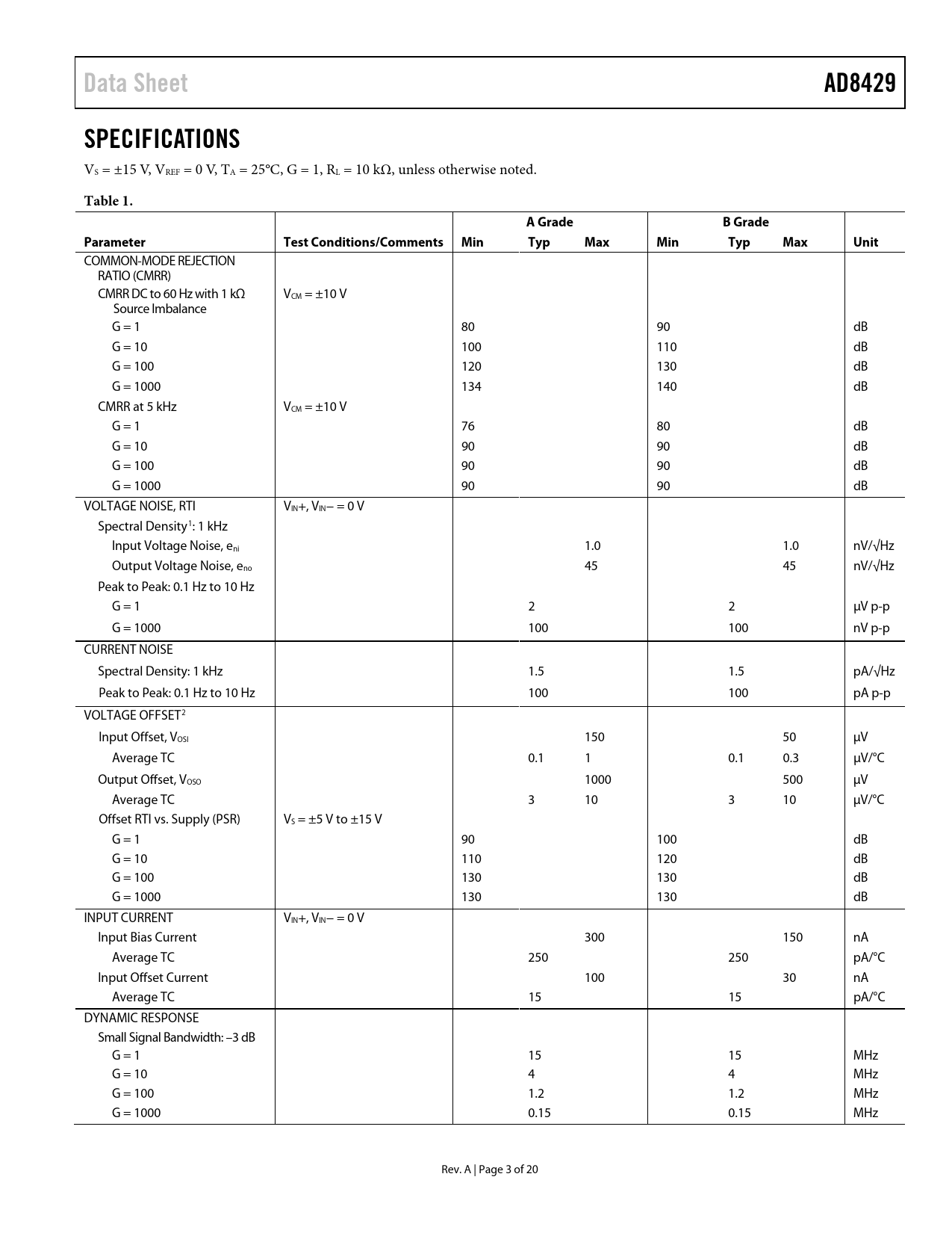 link to page 5 link to page 5 Data SheetAD8429SPECIFICATIONS VS = ±15 V, VREF = 0 V, TA = 25°C, G = 1, RL = 10 kΩ, unless otherwise noted. Table 1.A GradeB GradeParameterTest Conditions/CommentsMinTypMaxMinTypMaxUnit COMMON-MODE REJECTION RATIO (CMRR) CMRR DC to 60 Hz with 1 kΩ VCM = ±10 V Source Imbalance G = 1 80 90 dB G = 10 100 110 dB G = 100 120 130 dB G = 1000 134 140 dB CMRR at 5 kHz VCM = ±10 V G = 1 76 80 dB G = 10 90 90 dB G = 100 90 90 dB G = 1000 90 90 dB VOLTAGE NOISE, RTI VIN+, VIN− = 0 V Spectral Density1: 1 kHz Input Voltage Noise, eni 1.0 1.0 nV/√Hz Output Voltage Noise, eno 45 45 nV/√Hz Peak to Peak: 0.1 Hz to 10 Hz G = 1 2 2 µV p-p G = 1000 100 100 nV p-p CURRENT NOISE Spectral Density: 1 kHz 1.5 1.5 pA/√Hz Peak to Peak: 0.1 Hz to 10 Hz 100 100 pA p-p VOLTAGE OFFSET2 Input Offset, VOSI 150 50 µV Average TC 0.1 1 0.1 0.3 µV/°C Output Offset, VOSO 1000 500 µV Average TC 3 10 3 10 µV/°C Offset RTI vs. Supply (PSR) VS = ±5 V to ±15 V G = 1 90 100 dB G = 10 110 120 dB G = 100 130 130 dB G = 1000 130 130 dB INPUT CURRENT VIN+, VIN− = 0 V Input Bias Current 300 150 nA Average TC 250 250 pA/°C Input Offset Current 100 30 nA Average TC 15 15 pA/°C DYNAMIC RESPONSE Small Signal Bandwidth: –3 dB G = 1 15 15 MHz G = 10 4 4 MHz G = 100 1.2 1.2 MHz G = 1000 0.15 0.15 MHz Rev. A | Page 3 of 20 Document Outline FEATURES APPLICATIONS PIN CONNECTION DIAGRAM GENERAL DESCRIPTION REVISION HISTORY SPECIFICATIONS ABSOLUTE MAXIMUM RATINGS THERMAL RESISTANCE ESD CAUTION PIN CONFIGURATION AND FUNCTION DESCRIPTIONS TYPICAL PERFORMANCE CHARACTERISTICS THEORY OF OPERATION ARCHITECTURE RG Power Dissipation REFERENCE TERMINAL INPUT VOLTAGE RANGE LAYOUT Common-Mode Rejection Ratio over Frequency Power Supplies and Grounding Reference Pin INPUT BIAS CURRENT RETURN PATH INPUT PROTECTION Input Voltages Beyond the Rails Large Differential Input Voltage at High Gain IMAX RADIO FREQUENCY INTERFERENCE (RFI) CALCULATING THE NOISE OF THE INPUT STAGE Source Resistance Noise Voltage Noise of the Instrumentation Amplifier Current Noise of the Instrumentation Amplifier Total Noise Density Calculation OUTLINE DIMENSIONS ORDERING GUIDE